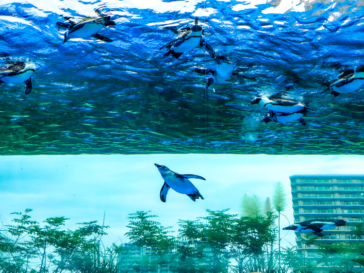 大都会をまるで飛んでいるかのようなペンギン!静止画だと不思議な写真になりました。こちらも同じようなユニークな展示方法に脱帽。