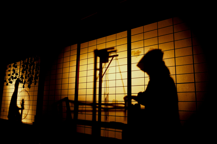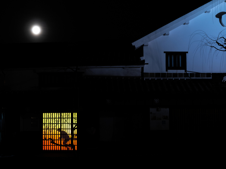この作例は今年の倉敷・美観地区でのイベントにて撮影したものです。こちらは障子の奥の人物は作り物ながら奇麗な動くシルエットで表現していました。このあと人力車に乗った花嫁さんが登場しますが、車夫の方がシルエットが美しく思えたので満月の月と白壁を取り入れて撮影しました。