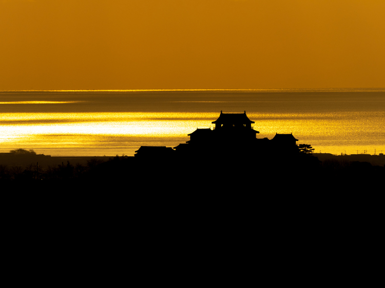この作例は愛媛・松山城の背後に太陽が沈むシーンを写したものです。適度に雲間から陽ざしが海へ映り込み、このような見事な金波のグラデーションを背景に影絵のような松山城が撮影できました。