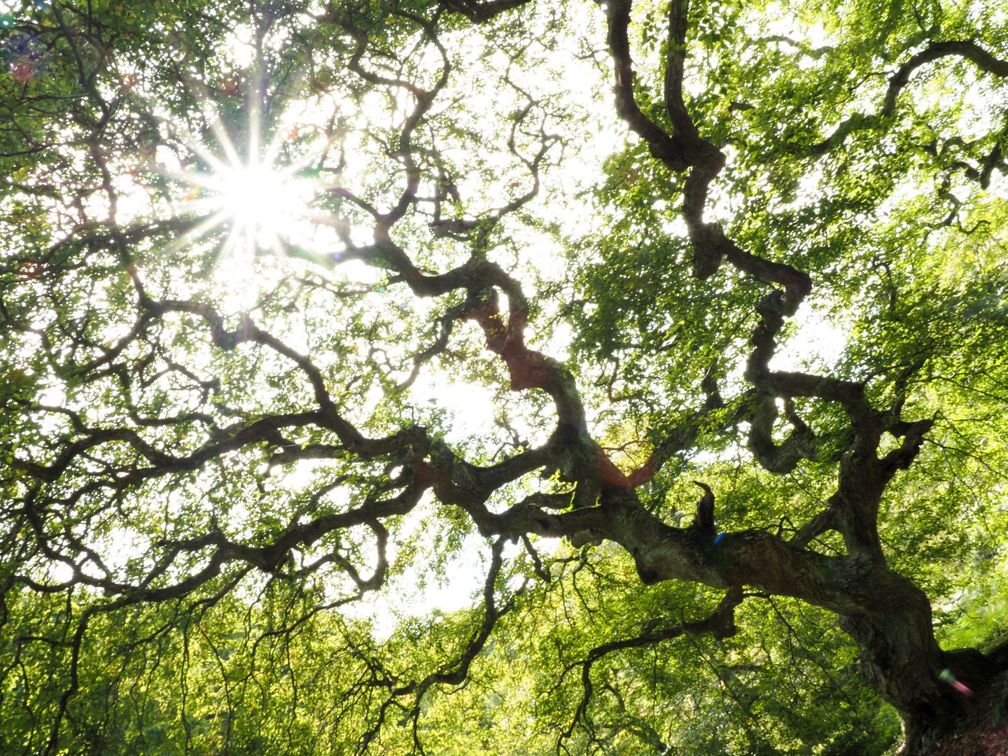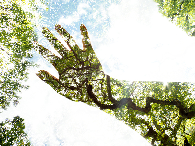 カメラを多重露光モードにセット後、1枚目は自分の手を太陽をかざしながら逆光で影絵にし、2枚目を北広島にある、形が非常に珍しい天狗シデという木を撮影すると・・・