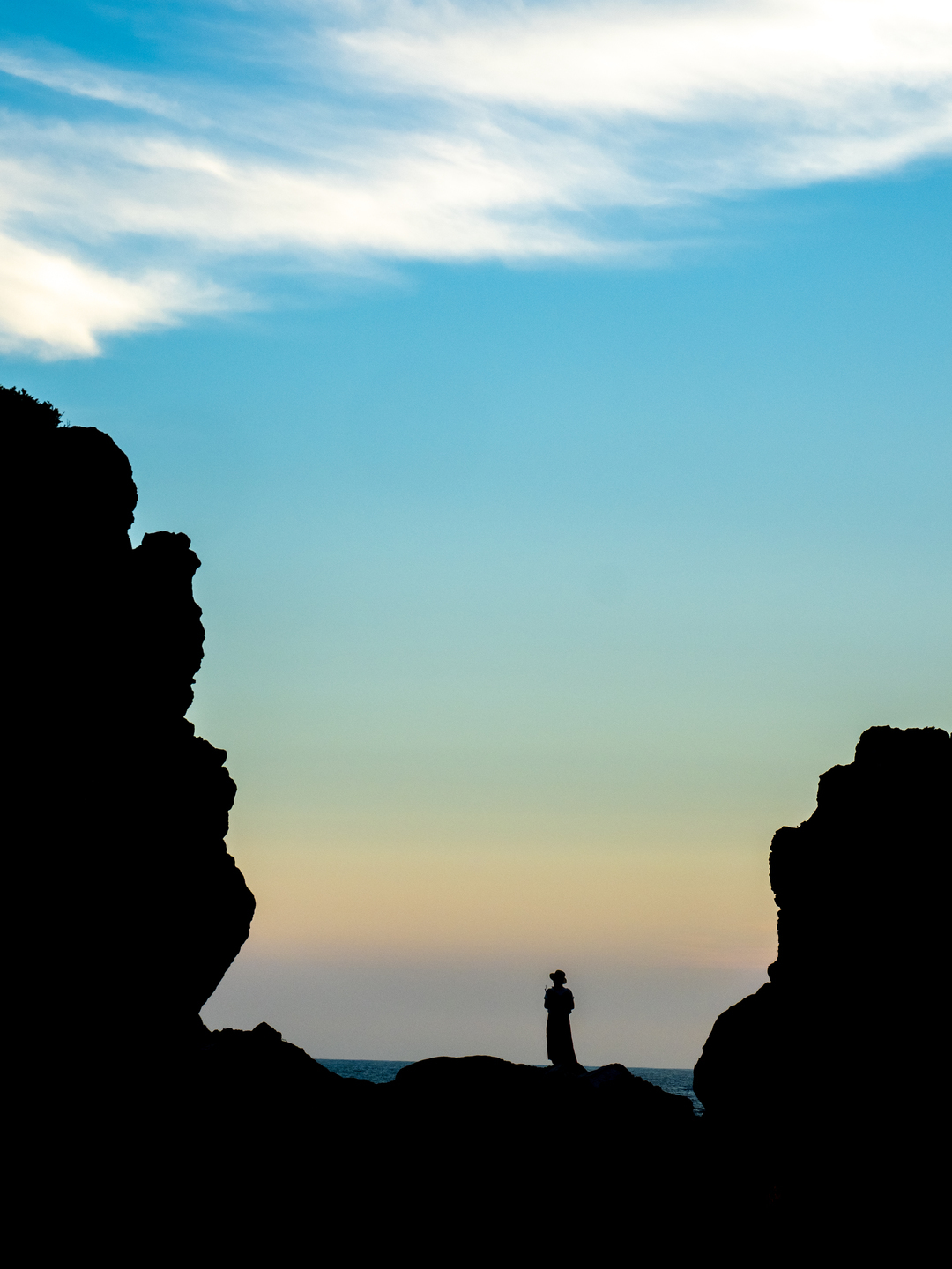 こちらの写真は室戸岬に撮影に行った時のもので、両端に迫る岩礁の間に一人寂しく佇んでいる女性を撮影しました。海を少し入れ、空の空間を多く取り入れて望郷に馳せる女性の想いという感じを表現すべく、撮影しました。