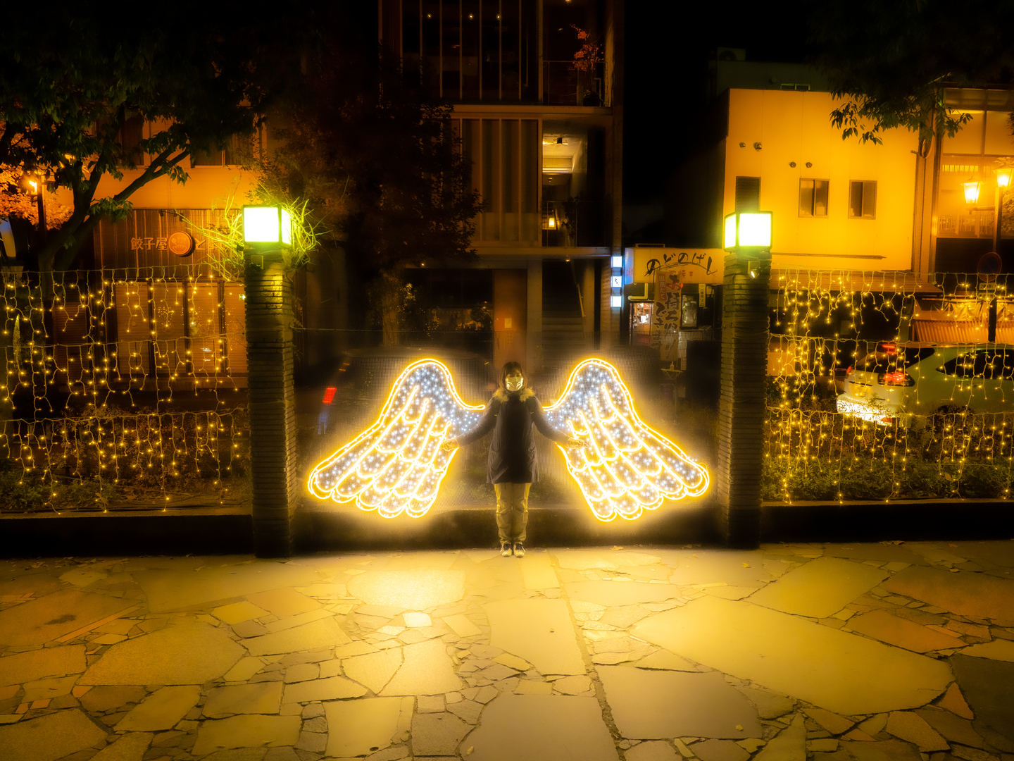 この写真はクリスマス頃の岡山市内のライトアップイベントです。アシスタントさんにお願いして翼の真ん中に立ってもらい、多重露光機能を使用してソフトフォーカスにして幻想的にしました。周りの風景を多く取り入れてこれから空に羽ばたく感じを出してみました。