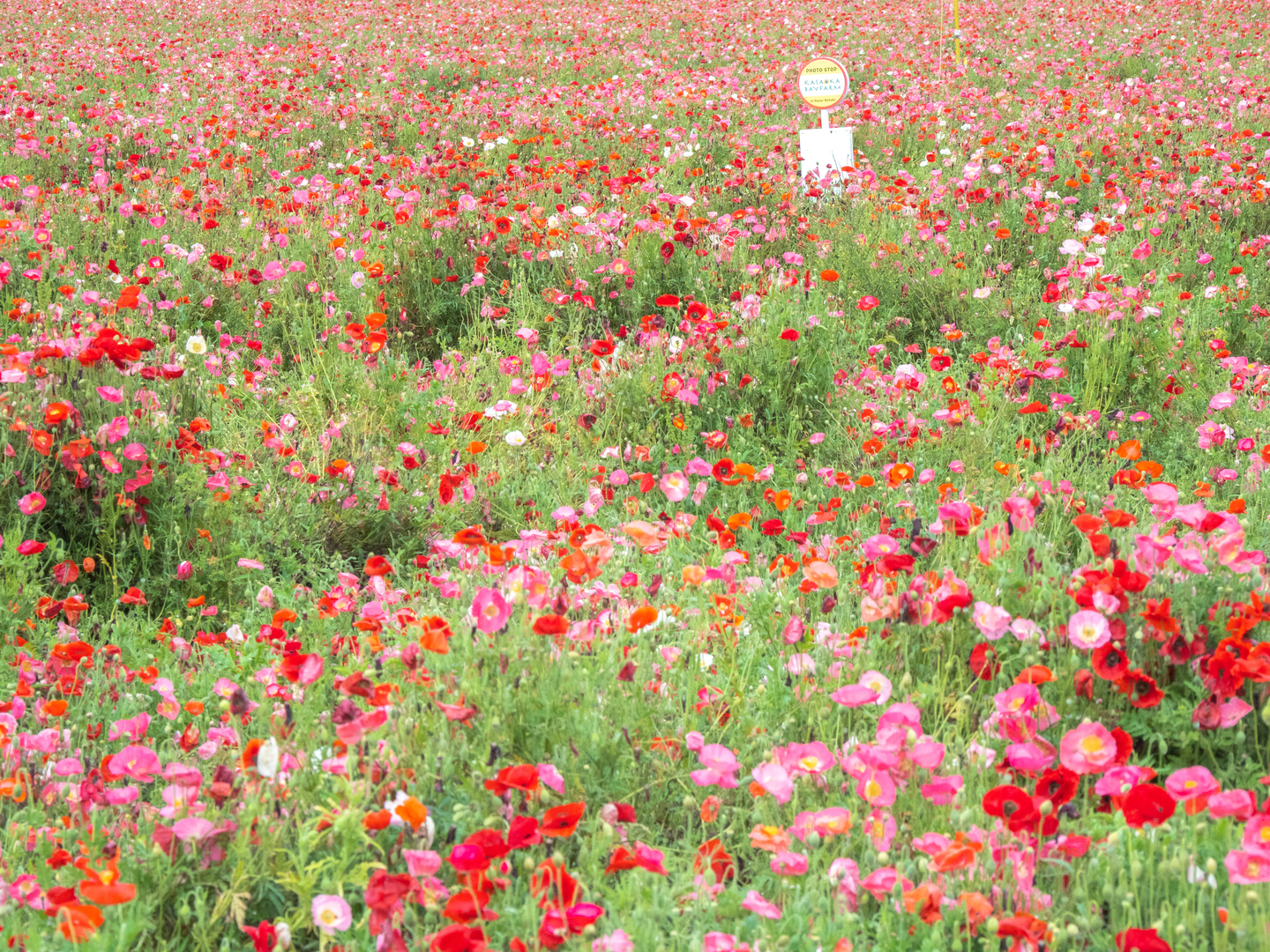 こちらは地元・笠岡の道の駅の前でのショットです。ここは毎年、広大な干拓地内にポピー畑が出現します。また、観光客誘致のためにこの様に洒落たバス停などをおいて来る人を楽しませる工夫がされています。人工的に造られた風景も、夢の中の出来事のような幻想的写真を作ることができます。