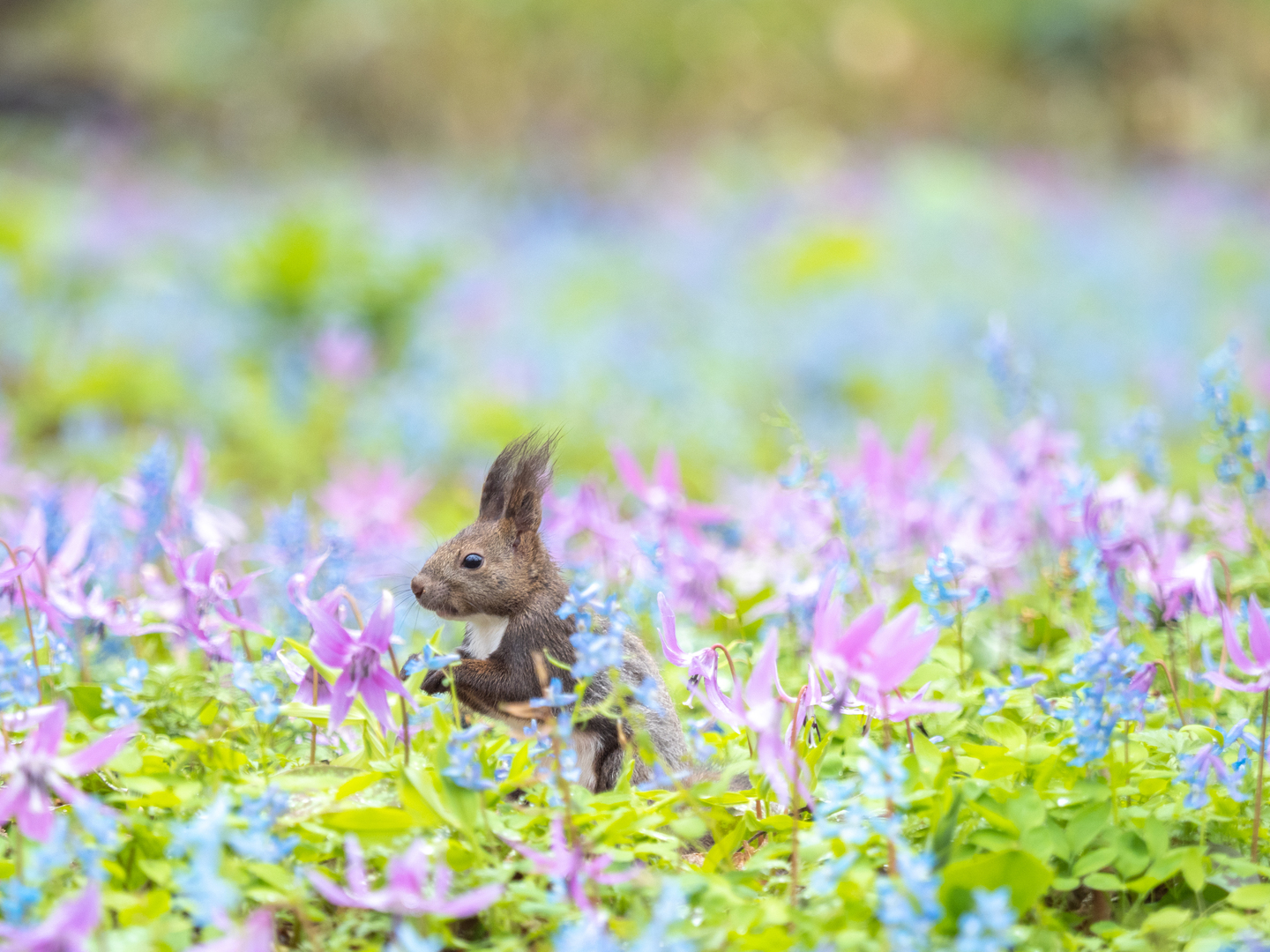 この写真は4月末に北海道で撮影したもの。沢山のカタクリやエゾエンゴサクの花が同時に咲いているこの限られた時期、花畑にエゾリスが入り込むと物語性を強く感じる作品になります。