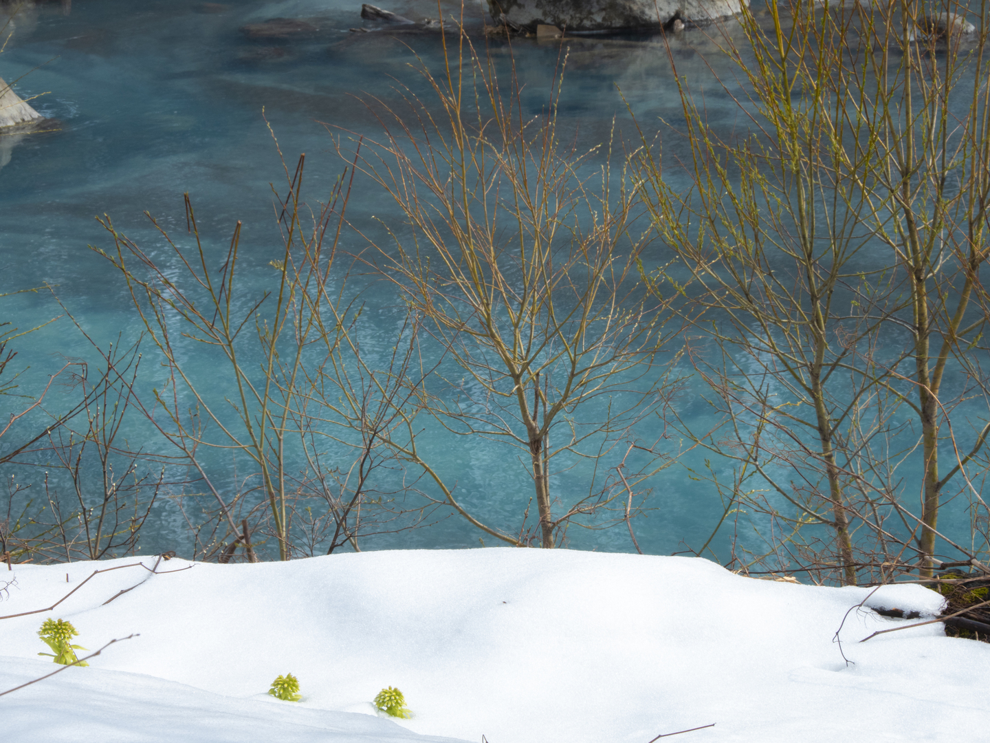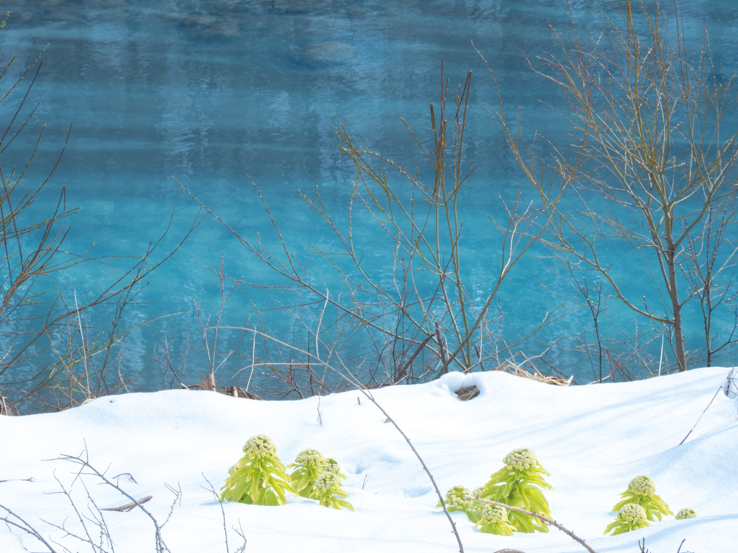 次に雪の写真です。雪の中から出るかわいらしいフキノトウ。この写真は春の訪れを感じられる風景ですが、フキノトウをもう少しクローズアップして背後の青い川をもう少し強調すると……
