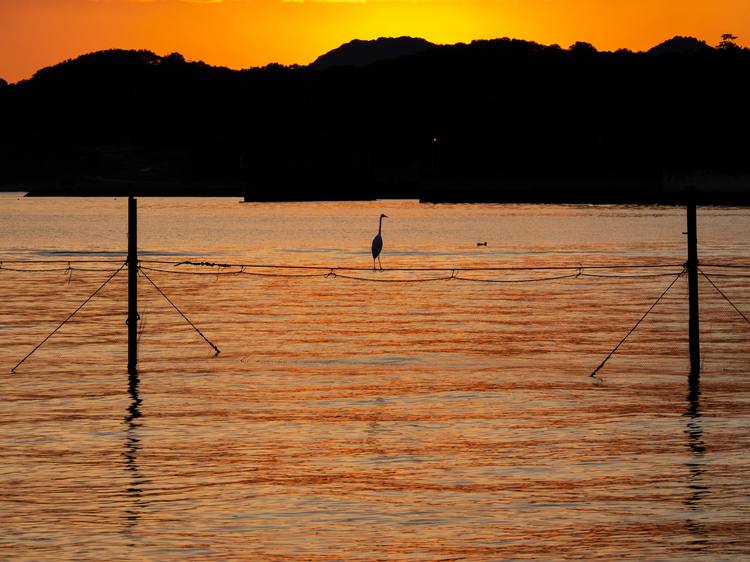 まずは、比較的簡単な夕暮れの時間帯での撮影です。近所の沙美海水浴場という場所で撮影しました。この作品は夕暮れ時、山に太陽が沈んだ直後に撮影したものです。太陽を入れると鳥の印象が弱くなりますので、太陽が沈んでから撮影するのがポイントです。夕暮れの時間帯での撮影をお勧めします。