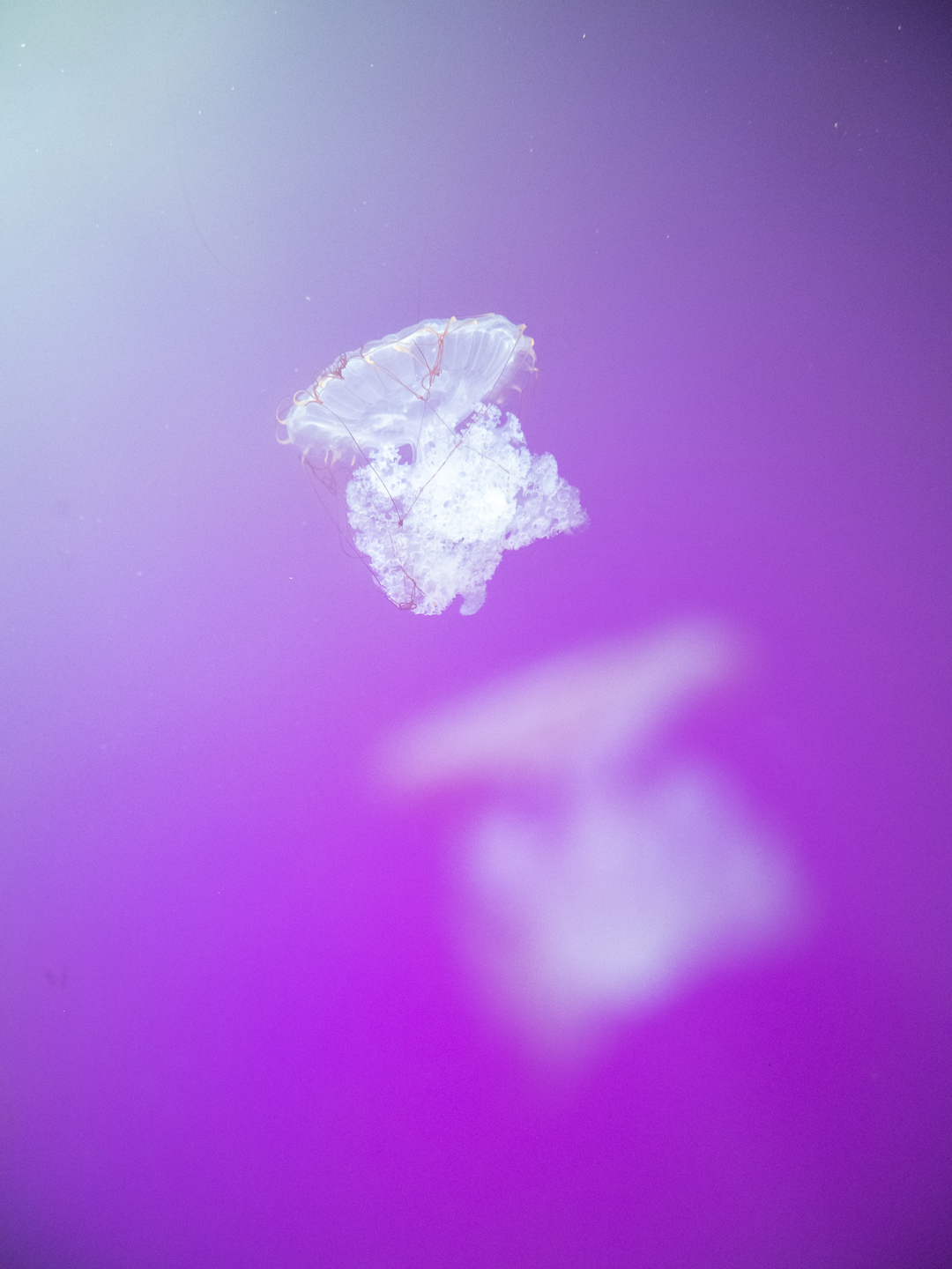 こちらは四国の屋島水族館でのショットです。クラゲの水槽は近年、多くの水族館で見受けられます。どの水族館も様々な工夫をして見るものを楽しませてくれますね。この水槽は奇麗なパープルのライトアップがされていました。多重露出機能を利用して縦位置で、1枚目はクラゲのピントを暈した撮影をして、2枚目はピントの合ったクラゲと左上のライトを意識して撮影したものです。この作品は宇宙に飛んでいく様子をイメージして表現してみました。