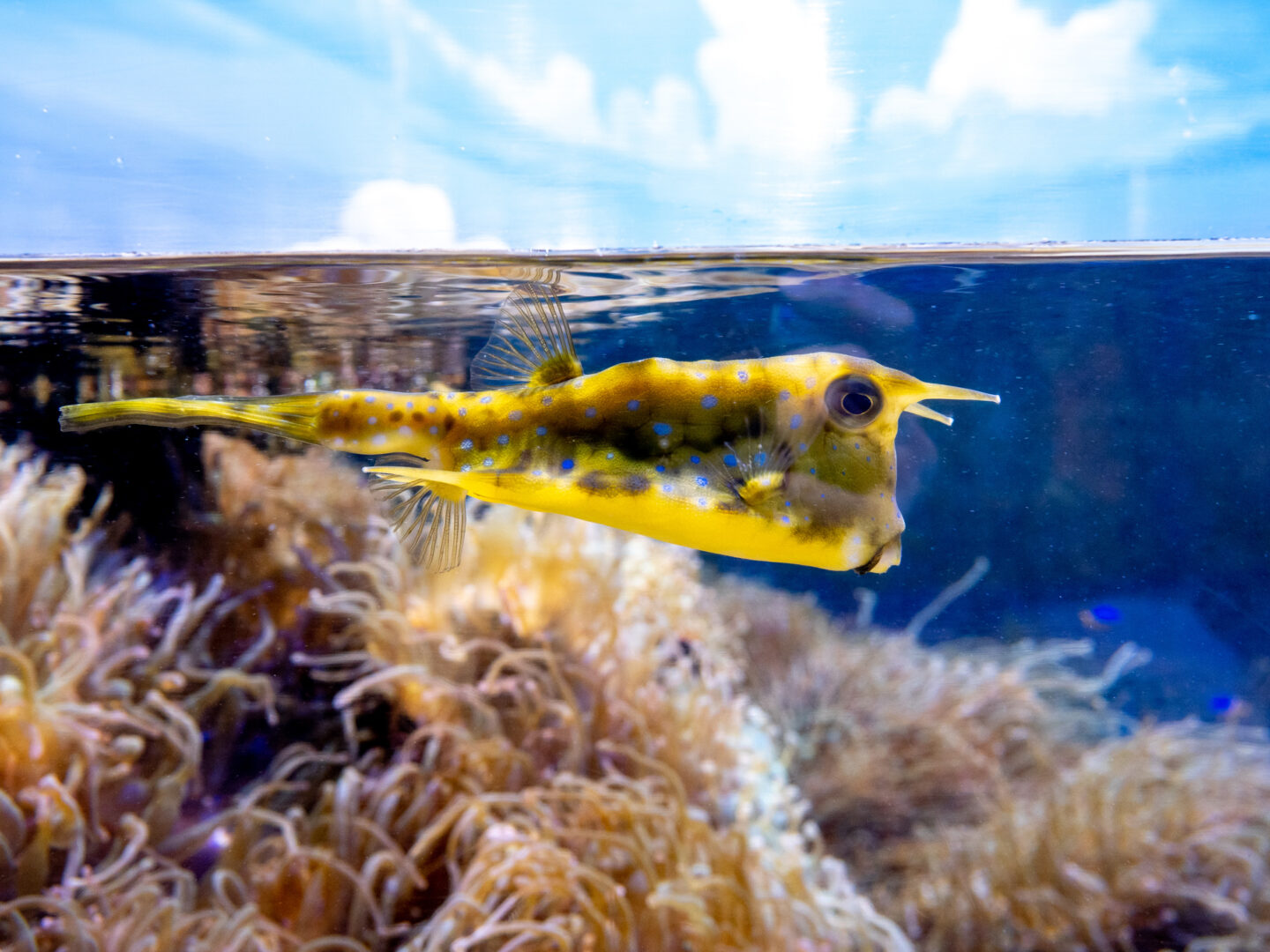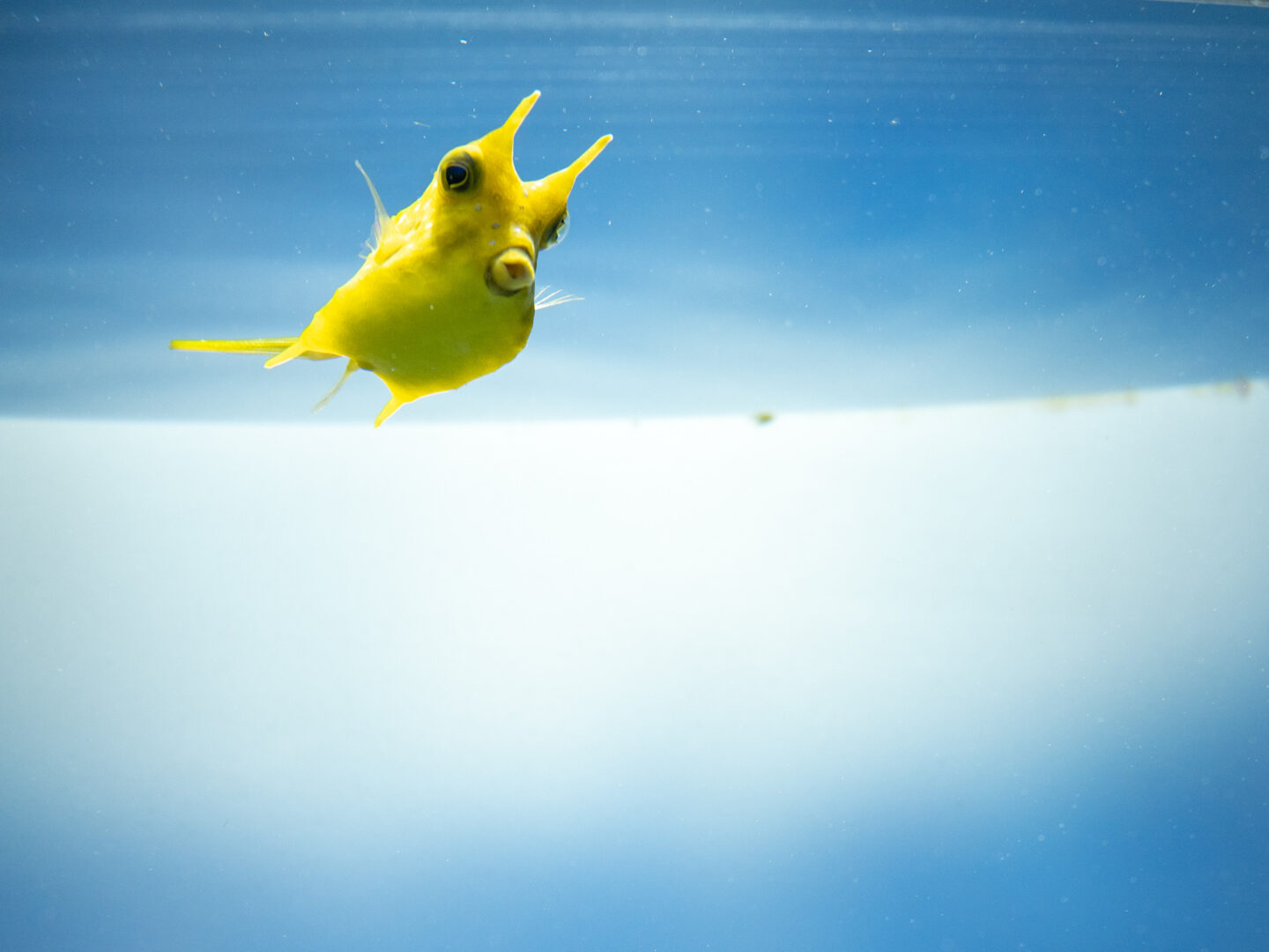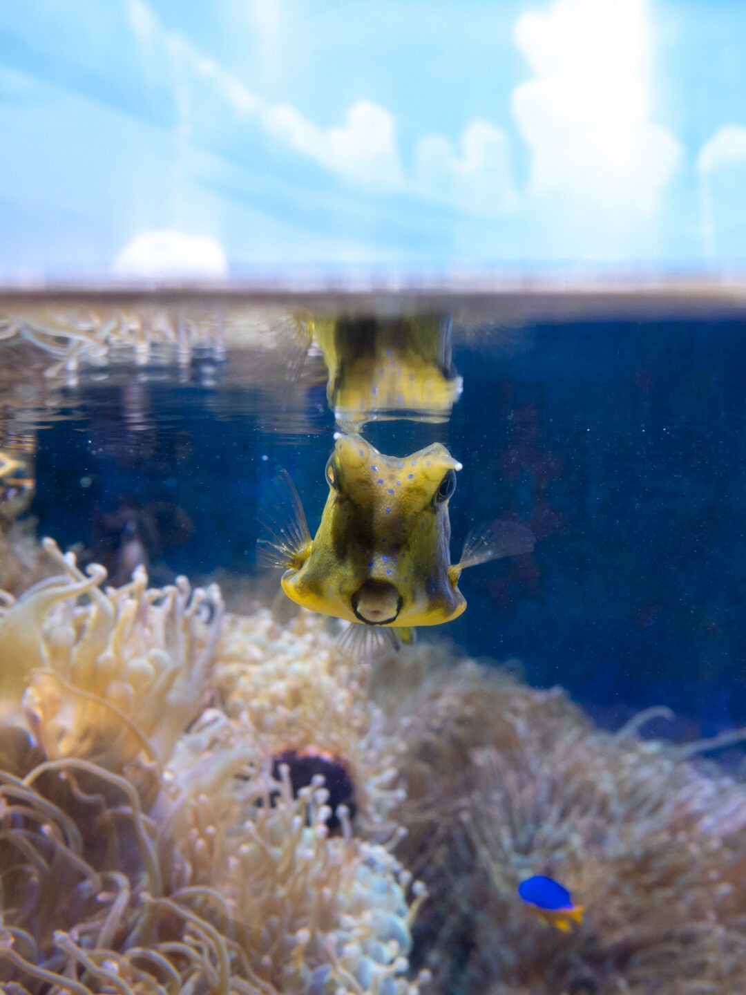 まずは入口付近の水槽から。真上や真横から覗き込めるこの水槽では、黄色い角のあるトナカイさんことコンゴウフグがお出迎えしてくれました。水面上に空(実は絵でした)があるのは下の動画を見ていただくと判りますので、このような水槽はとても絵にしやすいです。