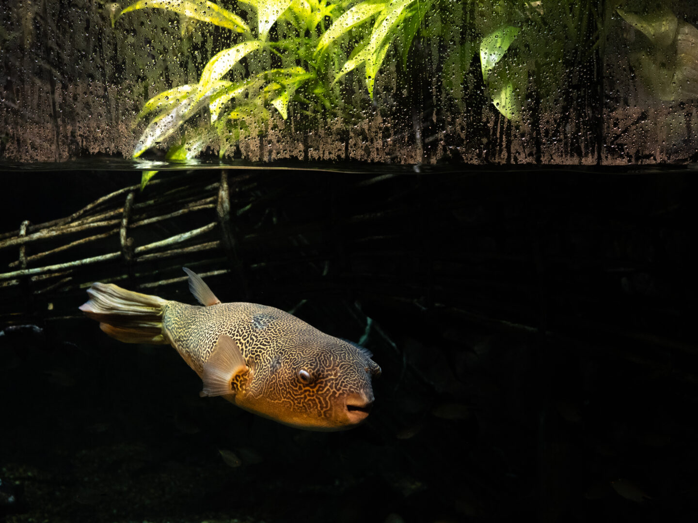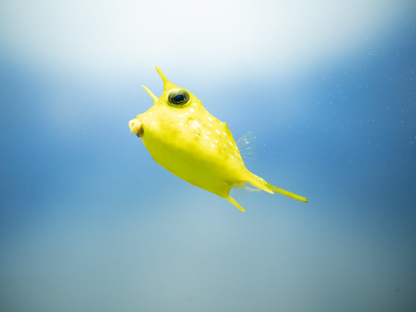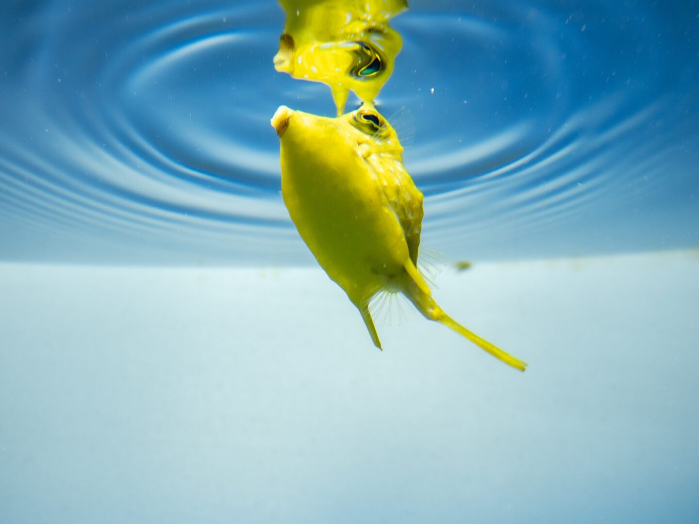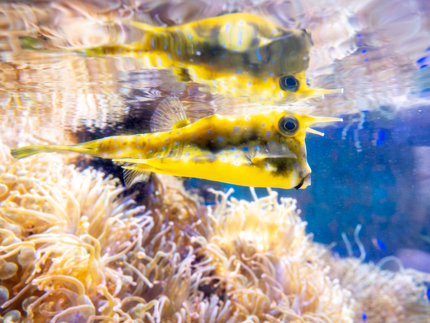 まずは入口付近の水槽から。真上や真横から覗き込めるこの水槽では、黄色い角のあるトナカイさんことコンゴウフグがお出迎えしてくれました。水面上に空(実は絵でした)があるのは下の動画を見ていただくと判りますので、このような水槽はとても絵にしやすいです。