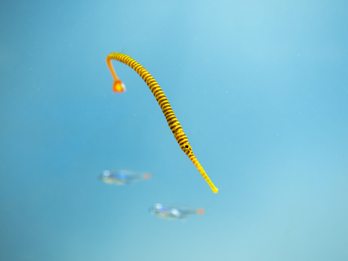 とにかく鳥羽水族館は魚の種類が多いので、ゆっくり周ると丸一日かかると思います。その分、古い水槽も多かったのですが背景が奇麗な水槽にイエローバンデッド・パイプフィッシュがいましたので、脇役に二匹のグラスフィッシュを取り入れて。
