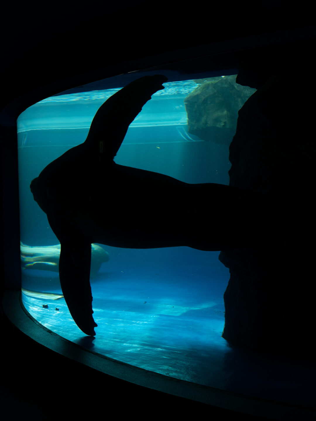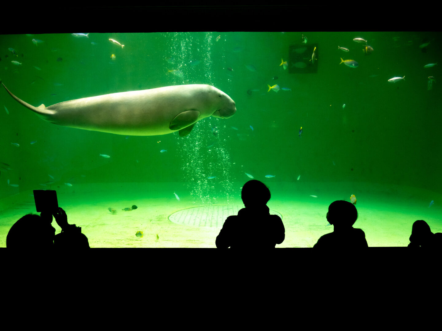 ジュゴン。いつか誰もいない水中でも見てみたいものです。これは逆に人物のシルエットをとりいれて水族館らしい表現に。