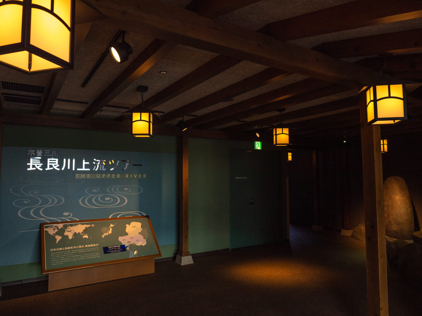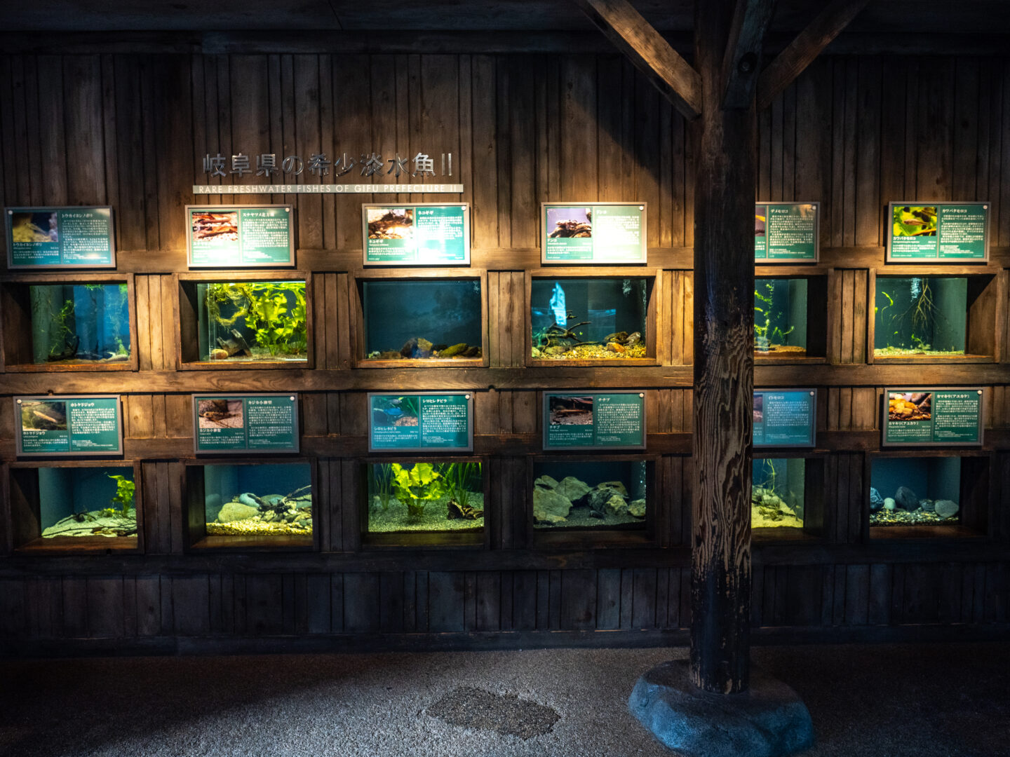 この水族館は淡水魚の紹介はもちろんのこと、まるで博物館のように館内の内装まで非常に凝っていて、中でも地元・長良川の淡水魚を美しいパネルやライティングなどを使用して詳しく紹介していました。