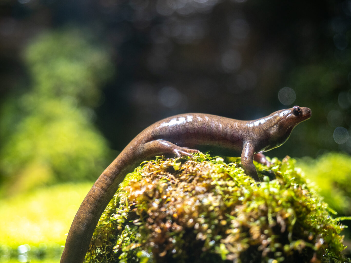こちらはサンショウウオが苔の上にポーズをとってくれていましたので、背景の丸ボケなどをいれながら撮影。