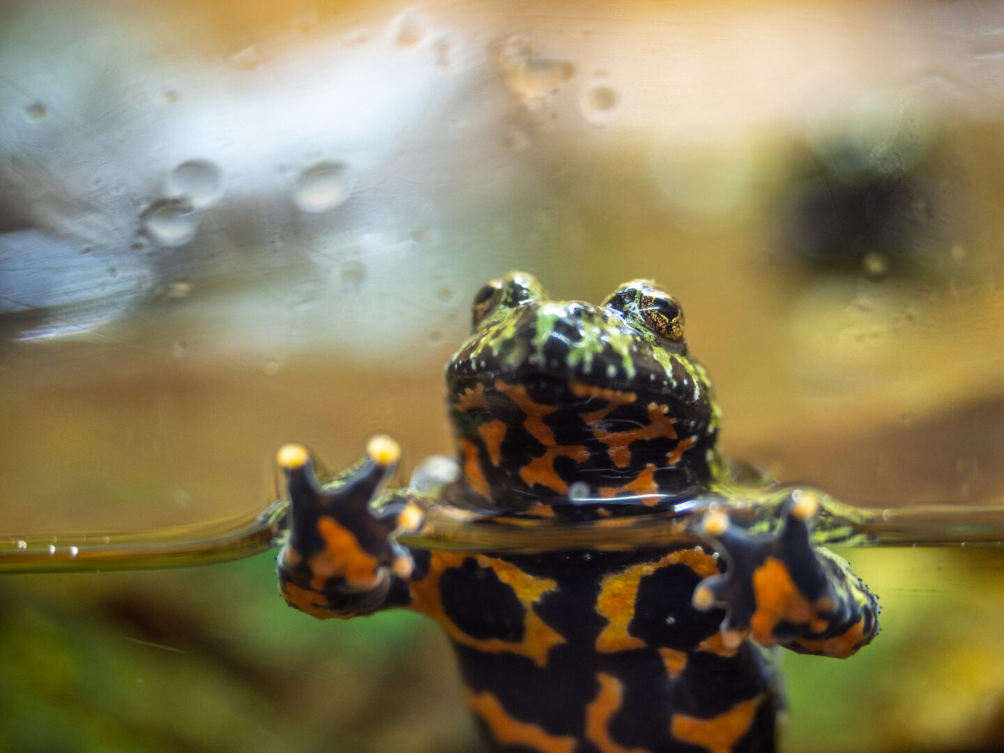 世界淡水魚園水族館という名前なのでここからは世界の淡水生物の紹介を。このカエルはチョウセンスズガエルというカエルで体の模様が特徴的でした。あえてガラスの存在感を目立たせるように撮影しました。