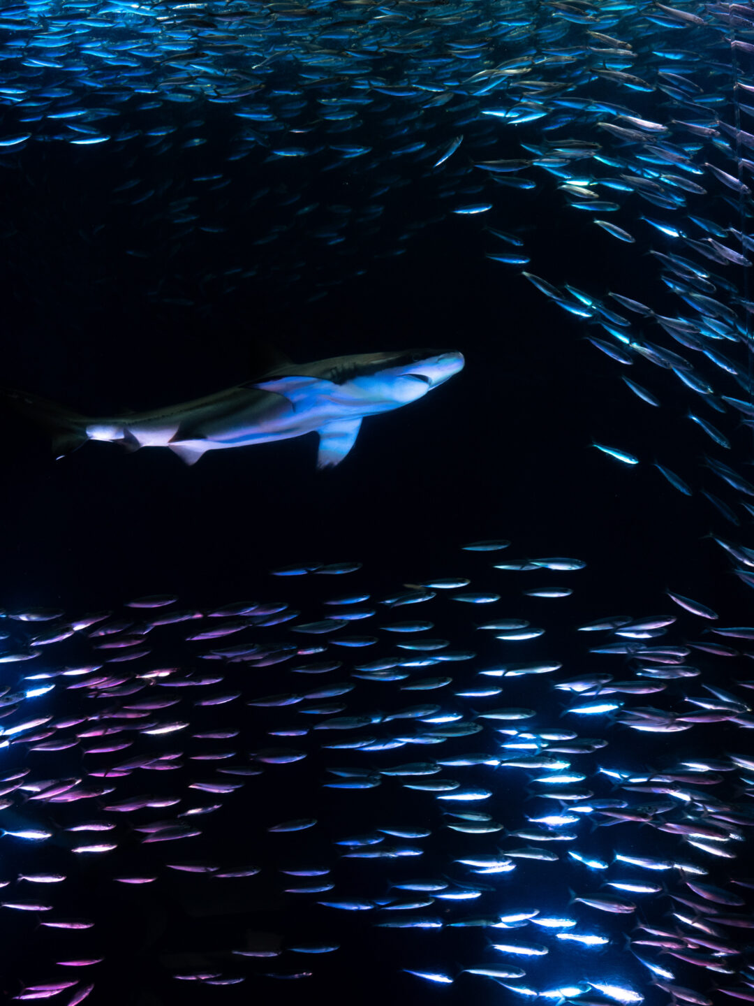 こちらは大人気イベント、黒潮大水槽のマイワシのトルネード。この水槽、イベントが始まる前はよく見かけるなんでもないイワシ展示状態なのですが、イベントが始まると写真のようにとてもフォトジェニックな光景になりますからイベント時間内に撮影することをお勧めします。動画も撮影したので参考にしてください。