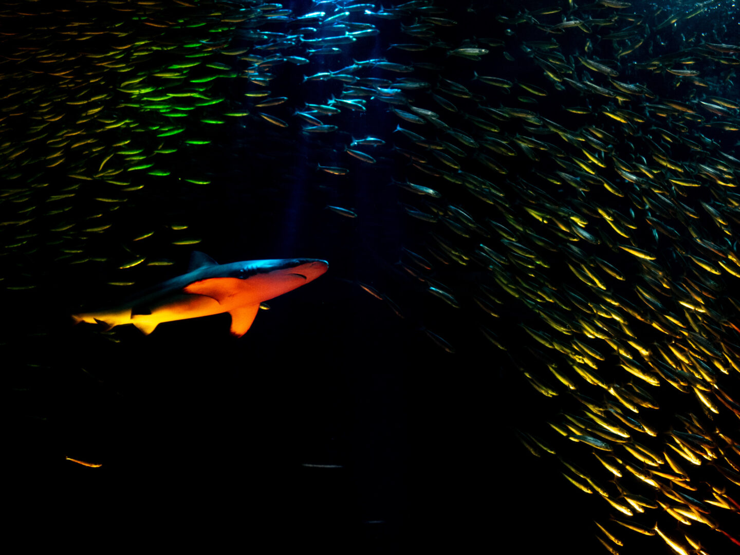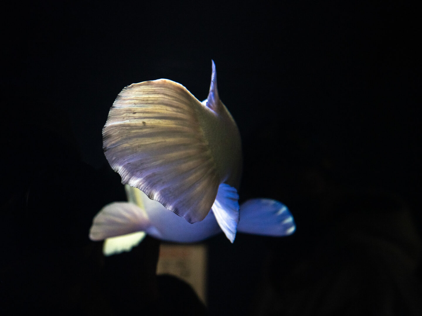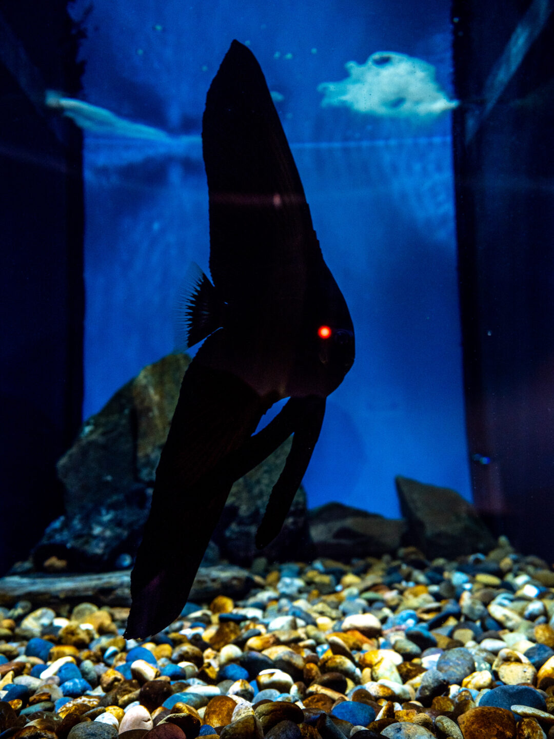 ナンヨウツバメウオの幼魚はいつ見ても個性的な形の魚です。あえてシルエットの表現にして、防火ランプの映り込みを目の部分に来るようにして撮影。こういった写真は水族館でしか表現できない写真ですね。