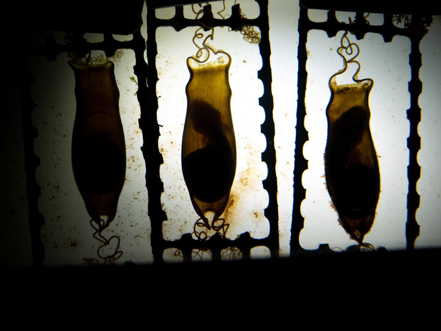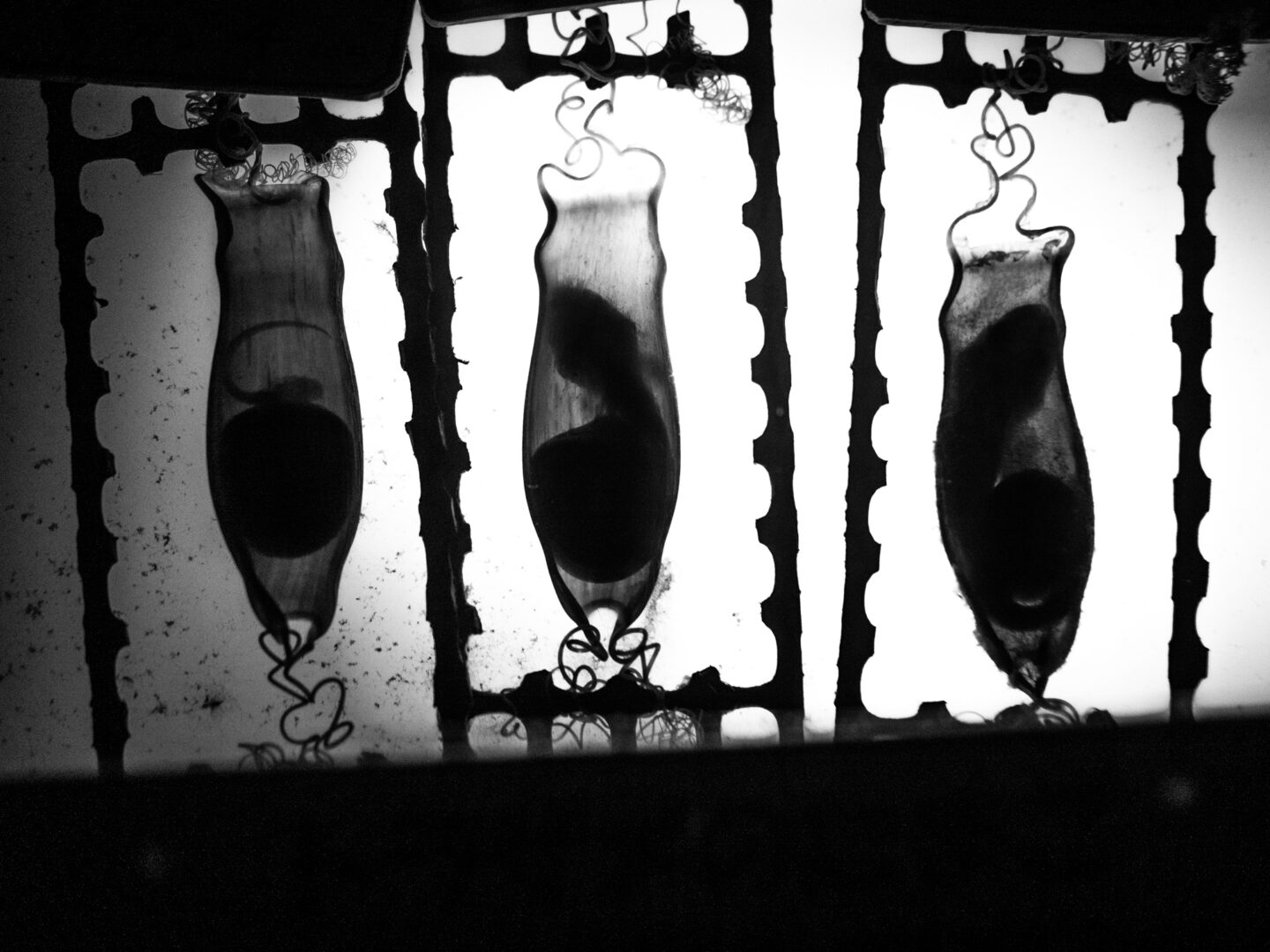 サメの卵を背後からライトアップして幼魚を展示するとても興味深い展示がありました。色付きで表現すると少し怖すぎる感じがしたのでモノクロで。