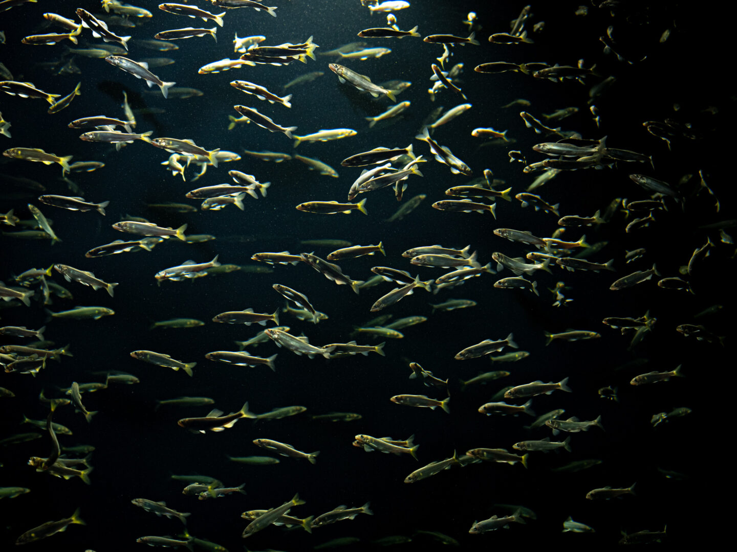 稚鮎の群れの展示。光の当たり方がとても奇麗でアユの形が良く判りますね。