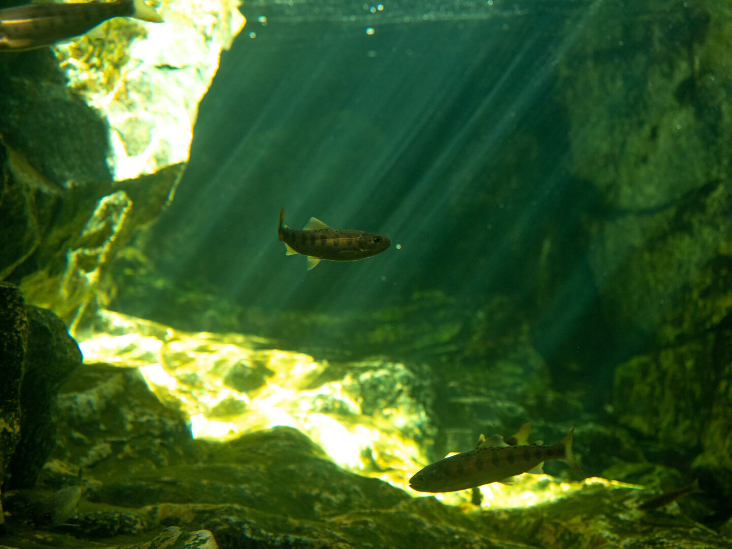 自然の光芒が差し込む水槽にアマゴが泳いでいました。とても美しい光景に見とれました。
