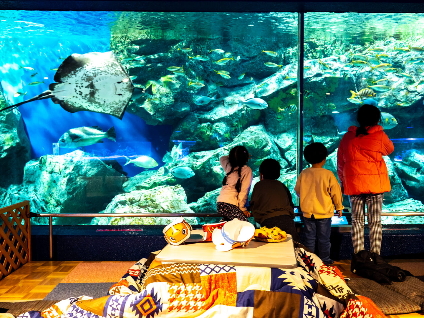 大水槽の前にこたつが!このような展示は初めて見ました!なんでもコタリウムと言うそうです(笑)。子供さんが居られる方にはとても良い展示だなと思いましたがカメラマンにとっては撮影が大変かも。