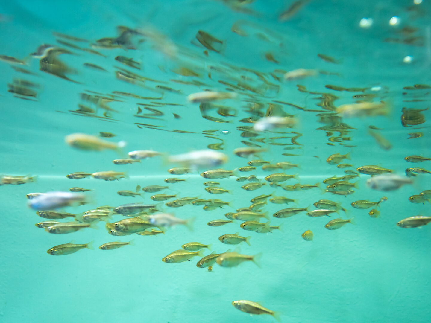 長良マスが沢山いる水槽。いい感じに並んだ瞬間を撮影しました。