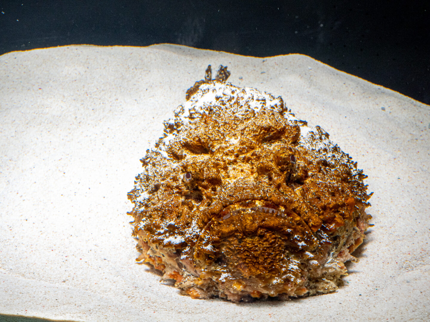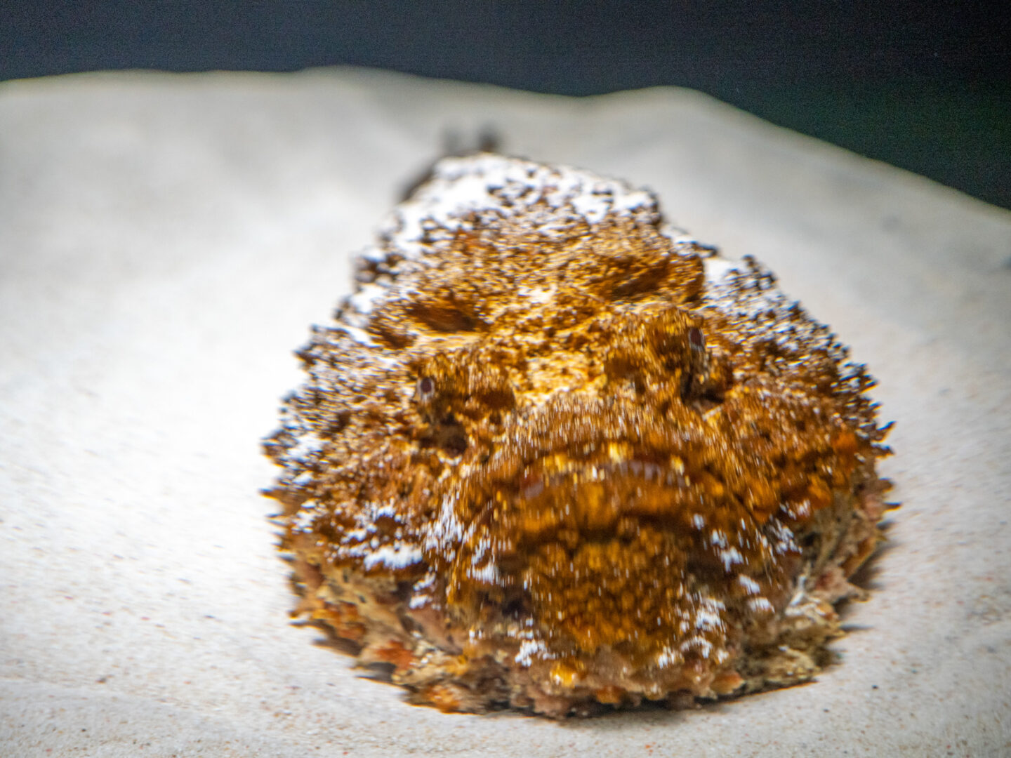 オニダルマオコゼが球体水槽にいたのでまずは絞り開放で撮影したのですが、どこにもピントが来てなくてイマイチでしたので再度絞りを絞って撮影したのが2枚目です。