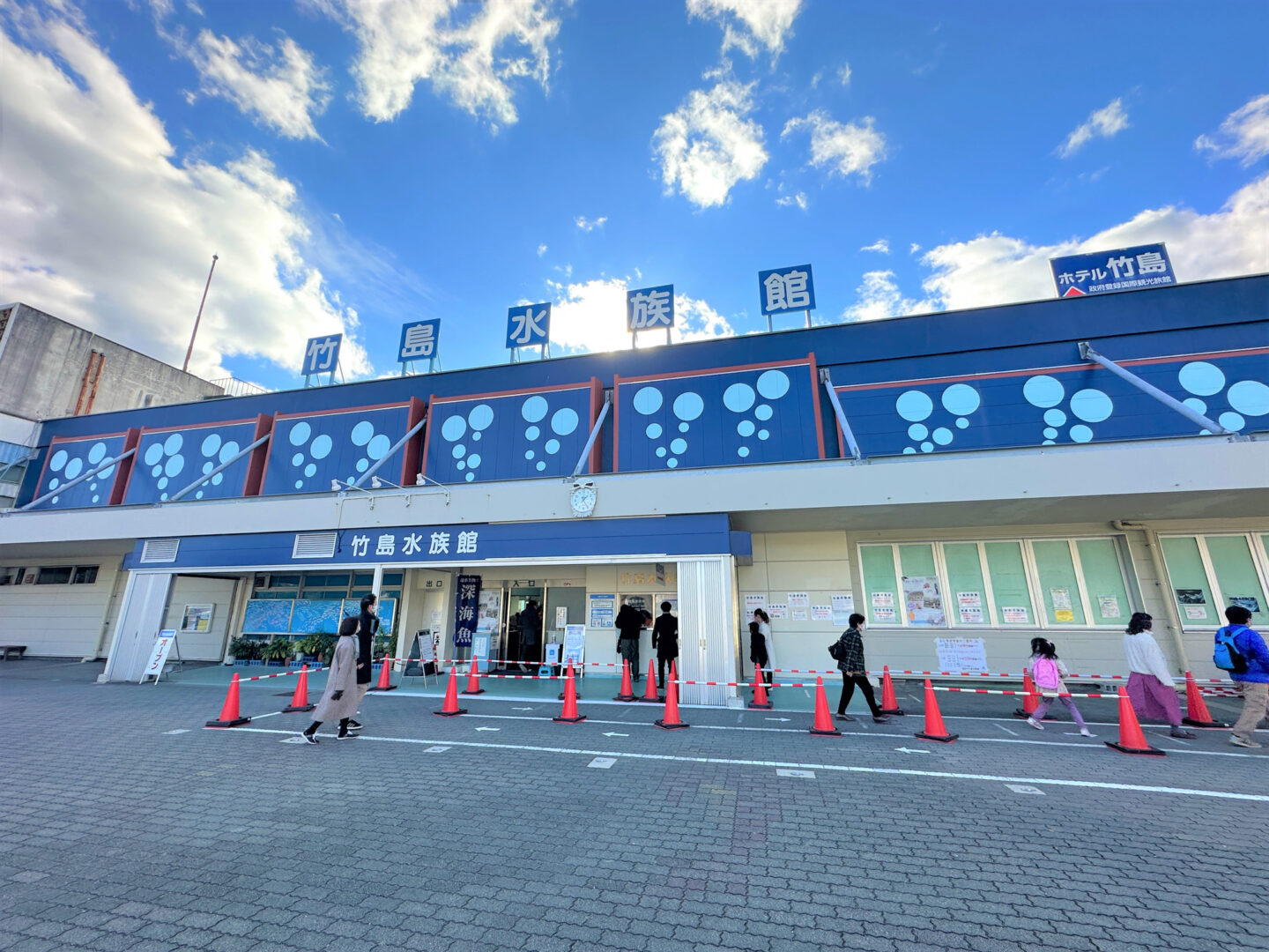 最後に紹介するのは現在とても注目を浴びている、「たけすい」こと竹島水族館です。この水族館はとても歴史のある水族館で建物は古く、一時は閉館しそうになるまで来館者が少なくなりかけたそうですが、スタッフのアイデアで見事に復活し訪れた日も凄い人でした。外観はこんな感じで昭和レトロを感じさせてくれます。