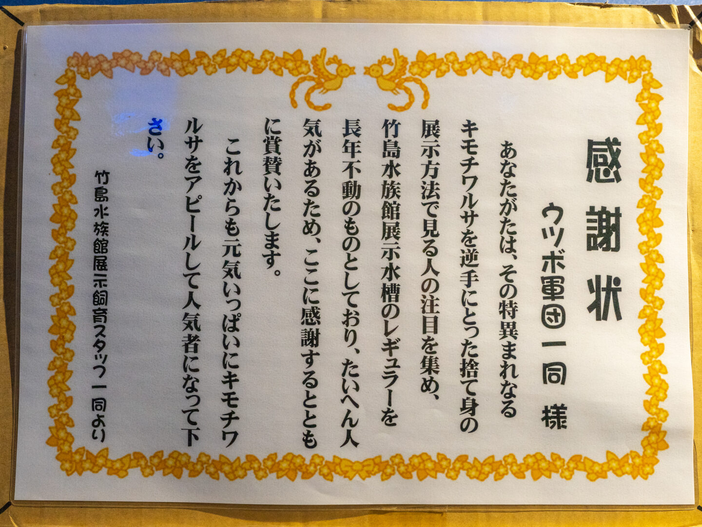 ウツボの展示の横にさりげなく表彰状が。この遊び心満載過ぎるユニークさこそがこの水族館のウリですね。ですので撮影よりもこの文章に見入ってしまいます(笑)。