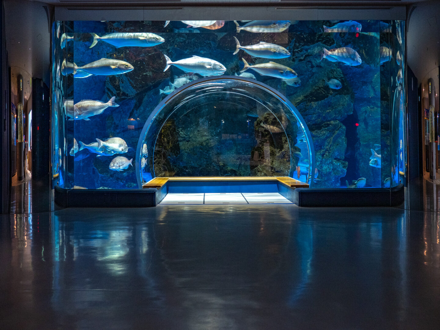 訪れた日は快晴でしたので、降り注ぐ太陽光で水中トンネルとイルカを撮影できました。