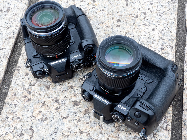 E-M1X(左)とE-M1 MarkII(右)を並べる。両者の最大の違いはE-M1Xではパワーバッテリーホルダーがボディー一体型となったことだ。