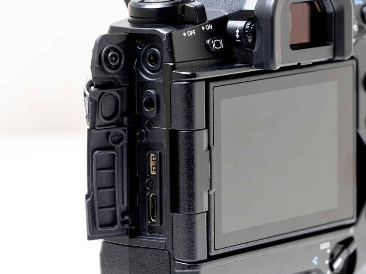 カメラ左側面には入出力ポートが用意されている。上から順に、マイク端子Ø3.5ステレオミニジャック(プラグインパワーOn/Off 可)、ヘッドホン端子Ø3.5ステレオミニジャック、HDMIマイクロコネクター(タイプD)、USBタイプCとなる。端子カバーは三分割。