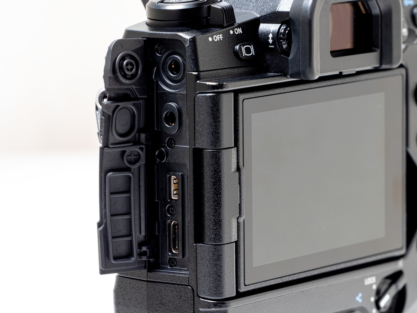 リモートケーブル用Ø2.5ミニジャック。E-M1 MarkII、E-M5 MarkIIIとリモートケーブルRMC-B2が共用可能。リモートケーブルを挿した状態でも防塵防滴効果を確保できるようにラバー製シーリングが用意されている(ただしリモートケーブルRMC-B2は防塵防滴構造ではない)。