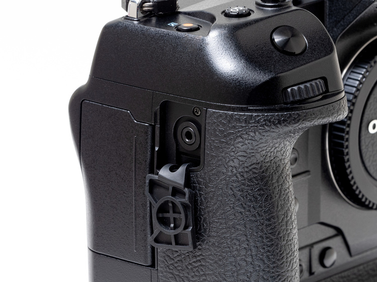 カメラ前面。パワーバッテリーホルダーとの一体型となったことで、E-M1 MarkIIのようにパワーバッテリーホルダーから分離してカメラ単体で使用することは出来なくなったが、その分、接合部における歪みが発生しなくなりカメラ全体の剛性があがった。