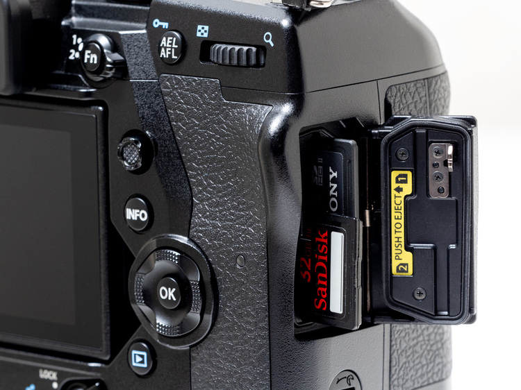 カメラ右側面にUHS-I/II対応 SDXC/SDHCメモリーカードスロットを二基搭載。両スロット共にUHS-IIに対応した。標準、自動切換、振り分け、同一書き込みが可能。スロットの蓋はゴムパッキン入りの防塵防滴仕様となっている。蓋は回転式のロックを回して解除する方式だ。