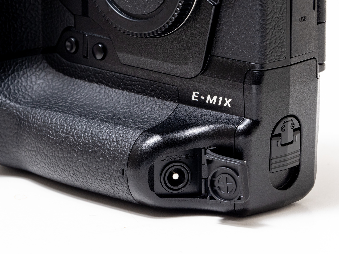 縦位置グリップの下部にあたる箇所にはDC入力端子が用意されている。ACアダプターAC-5を挿し込むことでE-M1Xに給電/充電が可能。AC電源が用意できる環境であれば充電池を交換することなく長時間の稼働が可能となる。