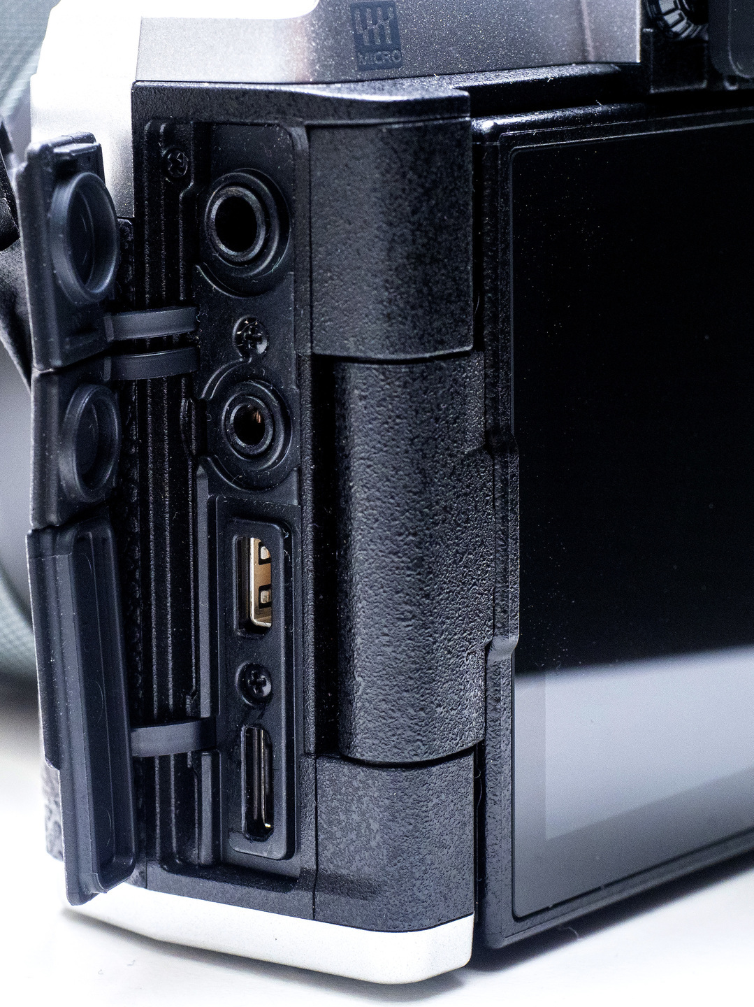 HDMIはタイプDマイクロコネクター。リモコン端子はØ2.5ミニジャックとなったことで、E-M1 MarkII / E-M1Xと共通のリモートケーブルRM-CB2が使える。外部マイク入力端子はØ3.5ステレオミニジャック(プラグインパワーOn / Off 可)。端子カバーは三分割となっている。