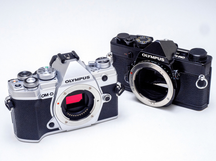 E-M5 MarkIIIはかつてのフィルム一眼レフカメラOMシステムのデザインを積極的に取り入れている。特にファインダー部の、いわゆるペンタプリズム部のとんがり形状がクラシカルな印象をより強くしている。このようにE-M5 MarkIIIをOM-1N(右)と並べて見ると両者がとても似ていることがわかるだろう。