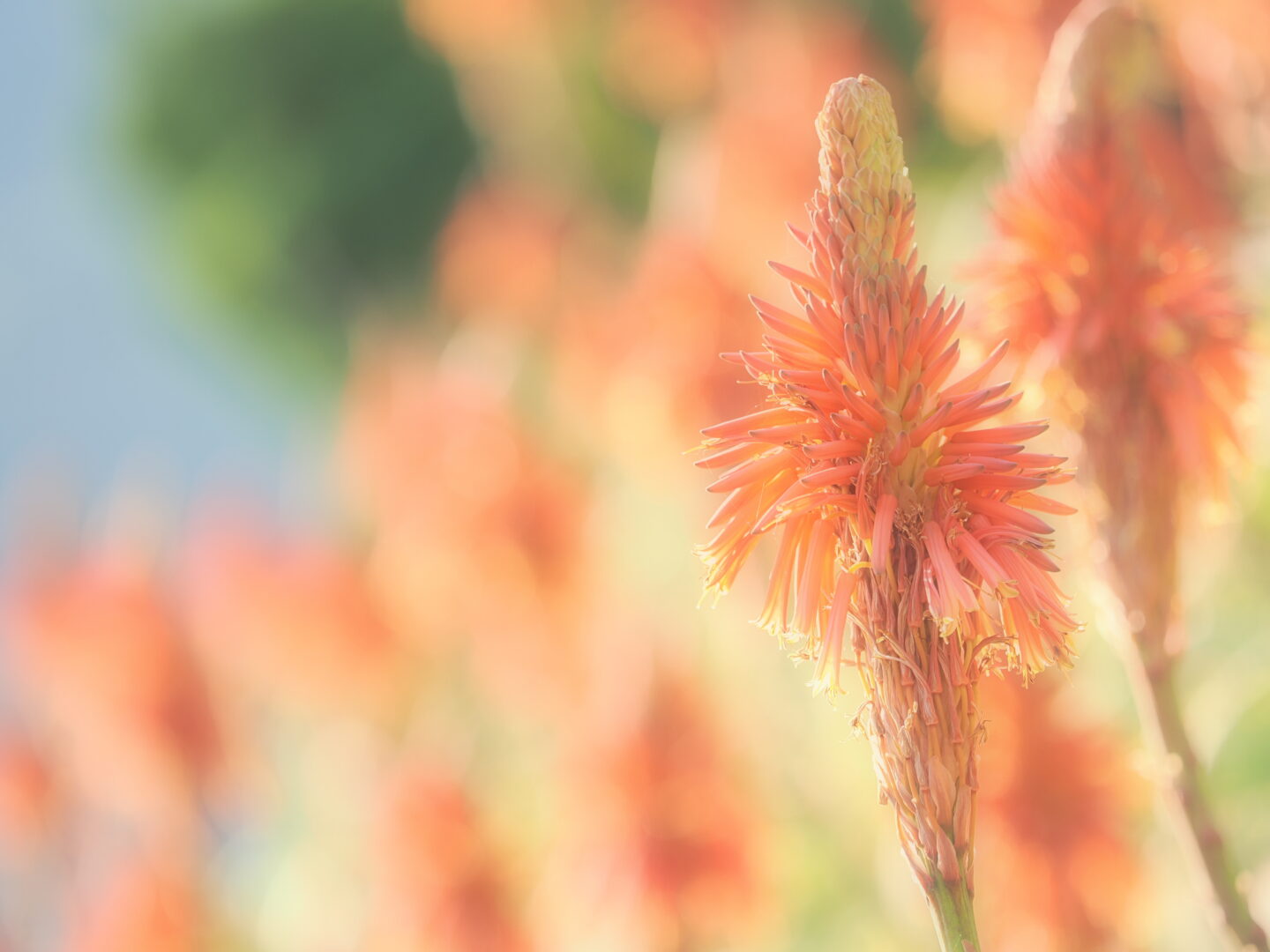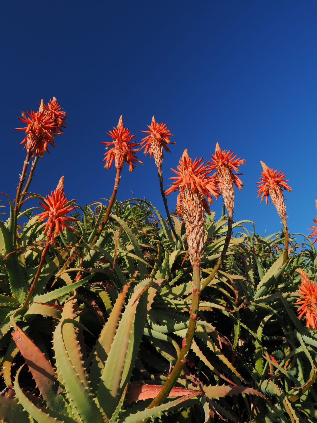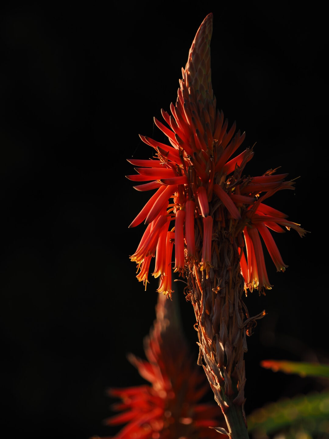 アロエは真っ赤な花の色を鮮やかに見せるのもいいですが、ハイキーに仕上げて淡く写すのも意外性があっていいと思います。群生しているところでは冬の澄んだ青空を入れて全体を写したり、前後にボケを入れて密集感を出すこともできます。海岸沿いで見られるアロエは背景に海を入れるのもいいでしょう。日没後の姿をシルエットで写すという変わり種もありましたね。好きな撮り方、イメージというのがあって、いつも同じような撮り方をしてしまいがちなのですが、今までにない撮り方を試してみると発見があります。もちろんボツ写真になることは多いですが、とにかく挑戦することが大切です。新たな年を迎えて、みなさんそれぞれの新たな花へのアプローチを探してみてください。