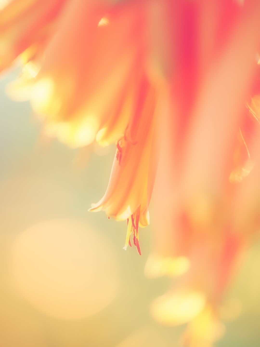 アロエの花に迫りました。下段から房状の花が次々に咲いていくのですが、花の先端部分が開いて、雌しべと雄しべが姿をのぞかせます。アロエの花をクローズアップするにしても、ここまでアップで写した作品はなかなか見ませんが、花の間から見た姿が可憐だったので、可愛らしく撮りました。小さな花のクローズアップとなるとマクロレンズが1本あると便利ですね。通常のレンズでは迫れないほどの倍率での撮影が可能で、近接撮影時の画質もシャープなものがほとんどです。被写体に迫ることで大きなボケも得られるので、写真のように花と花との距離が近くても大きな前ボケを作ることができます。