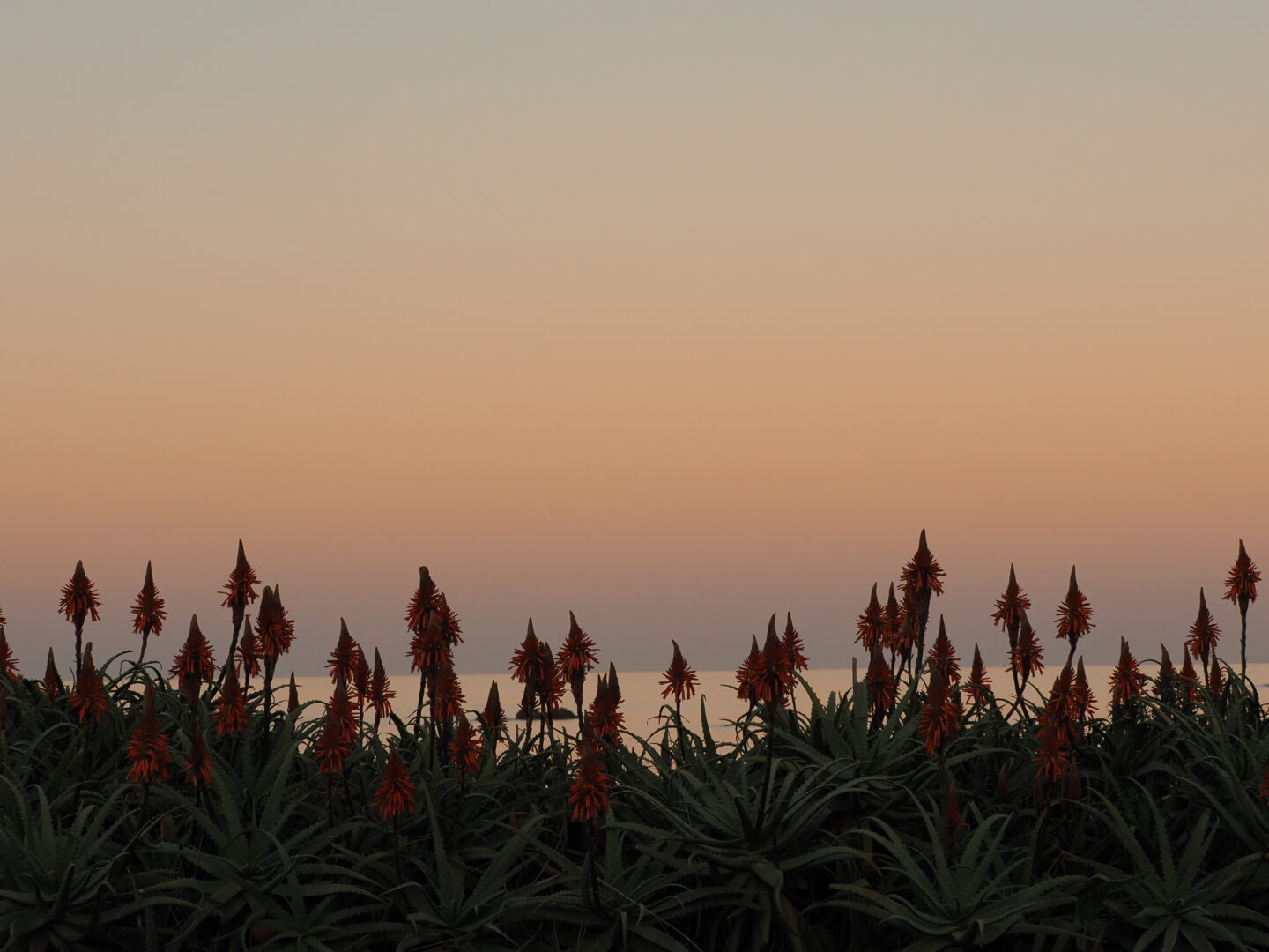 日が沈むと、ほんのりと空が赤色に染まり始めました。空の色が映って海も赤く見えます。雲がなかったので、期待するような夕焼け空とはいきませんでしたが、淡い感じがとても素敵でシャッターを切った一枚です。辺りはかなり暗かったのですが、アロエの赤色もうっすらと感じられるようなトーンが残っていました。派手目な花だからそこ、この淡い光の中でも存在感が出たのかなと思います。アロエが日本的な植物ではないので、ちょっと海外の風景にも思えてきますね。アロエはそんな不思議な魅力を持った植物です。