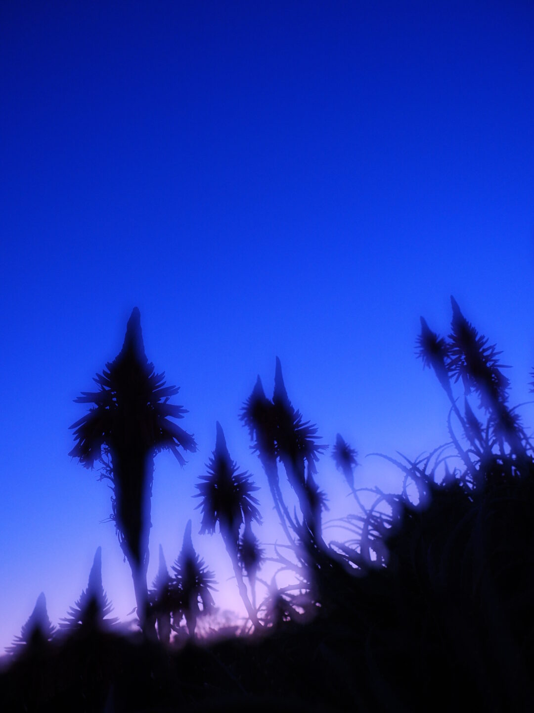 夕暮れの写真を撮影した後に撮っているので、かなり暗い状態で撮影しました。それでも空にほんのりと明るさがあったので、アロエをシルエットで撮ってみました。形が特徴的な花はシルエットにしても、その花が何なのかわかりますね。ここで初めての試みをしたのですが、シルエットの写真で画像合成(多重露出でもOK)をするとどう写るのか。一枚はピントを合わせて、一枚はピントをぼかして撮りました。するとシルエットの黒い部分にぼけた明るい部分が染み込むように滲み、ソフトな印象に仕上がりました。ぼかしすぎると明るい部分が侵食し過ぎてしまうので、ちょっとぼかすのがポイントです。