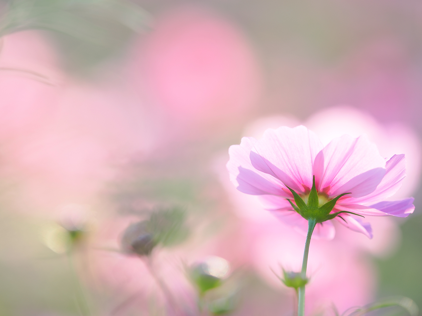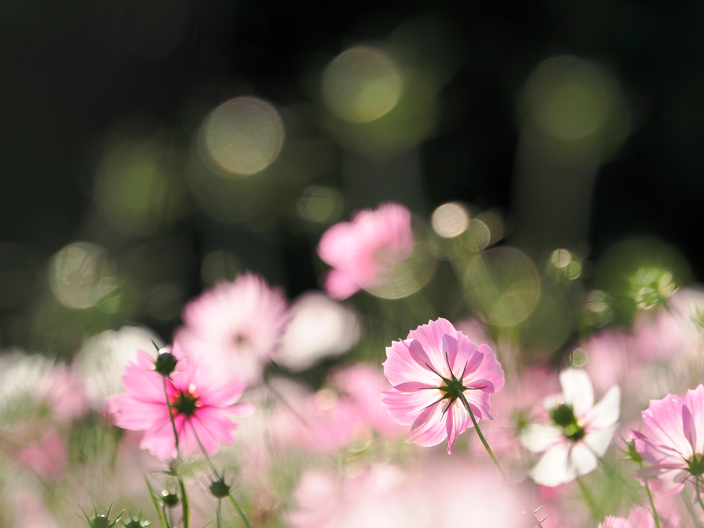 画面にたくさん浮かんでいる丸い光のボケは、コスモスの蕾。