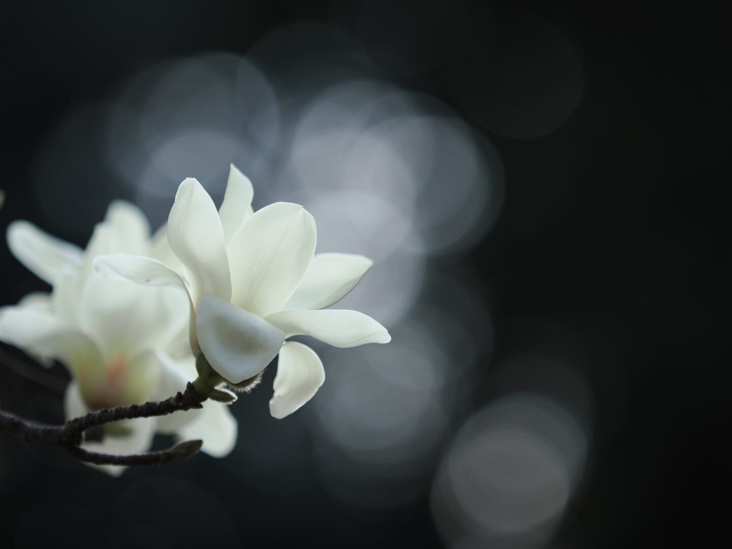 枝が入らないようにするためにいちばん先端の花を選んでいます。主役の花には光が当たり、背景の木々は逆光で影になっていたので、主役に露出を合わせると、明暗差から背景は黒く写りました。しかし、背景が平面的な黒一色では寂しいので、輝きを感じる丸いボケを入れています。このボケの正体は木々の木漏れ日の部分で、花とうまく重なるように上下左右に細かく動いて、ポジションを選びました。ハクモクレンは白いのでプラス補正が必要と思いきや、背景が黒いので、白と黒の面積を足すと約半々になります。そのため、補正なしで適正露出となりました。