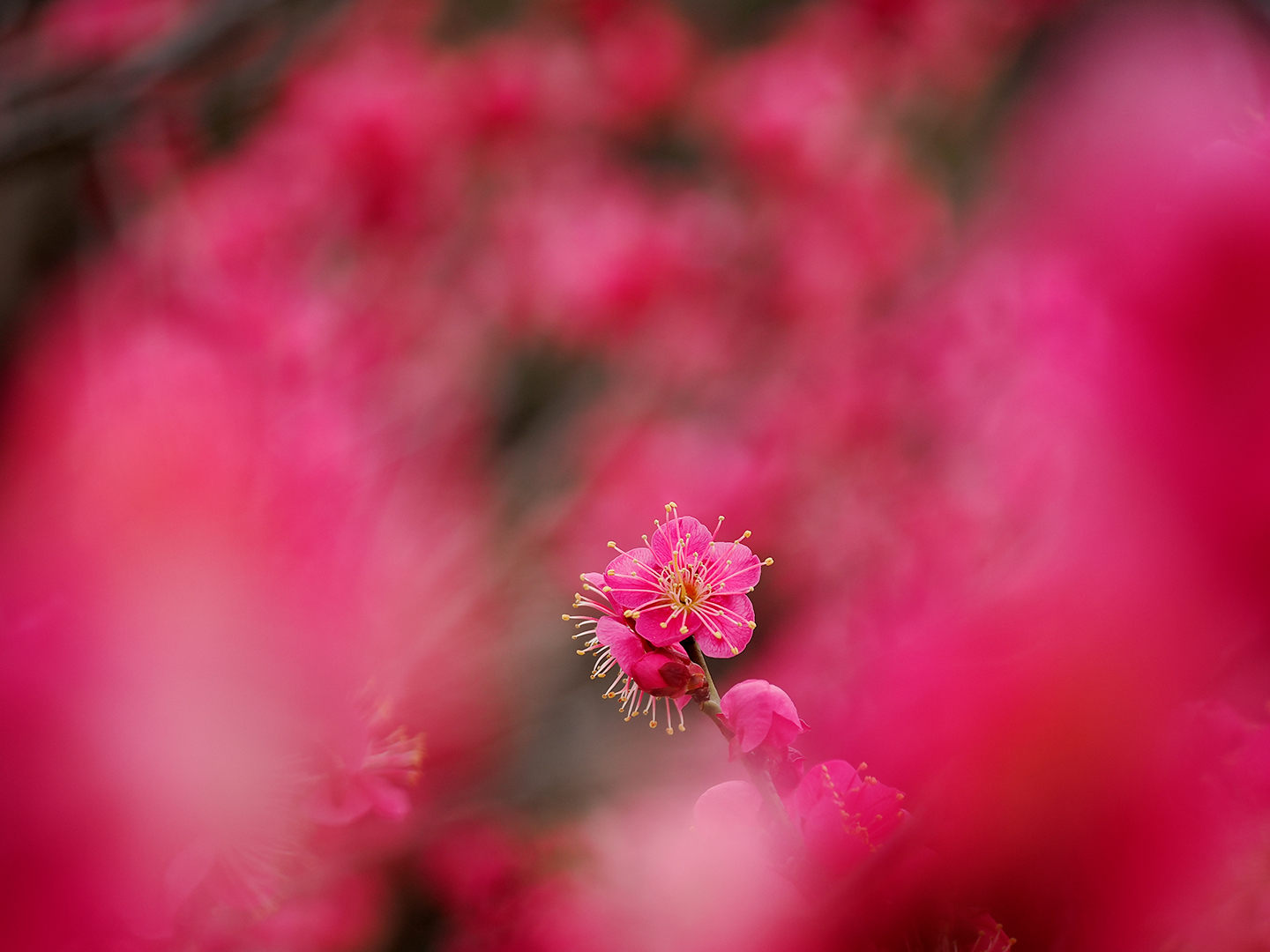 密集して咲く花の中から顔をだした一輪の梅。この一輪を引き立てるため、周囲にある花や枝など煩雑なものを前ボケで隠しました。