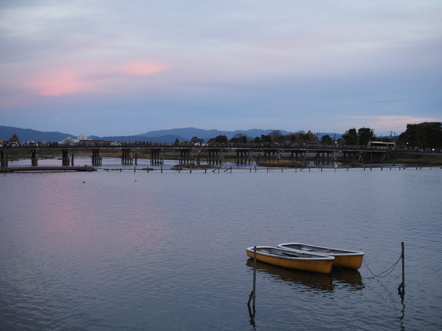 夕暮れの京都・嵐山の渡月橋を望んでほんのり染まったサーモンピンクの空と、それを映す川面を撮影。手前にボートを入れましたが、ボートまでの距離があることから特別デフォルメされたりすることもなく、画面全体として極端な遠近感や圧縮効果が感じられることなく収まっています。