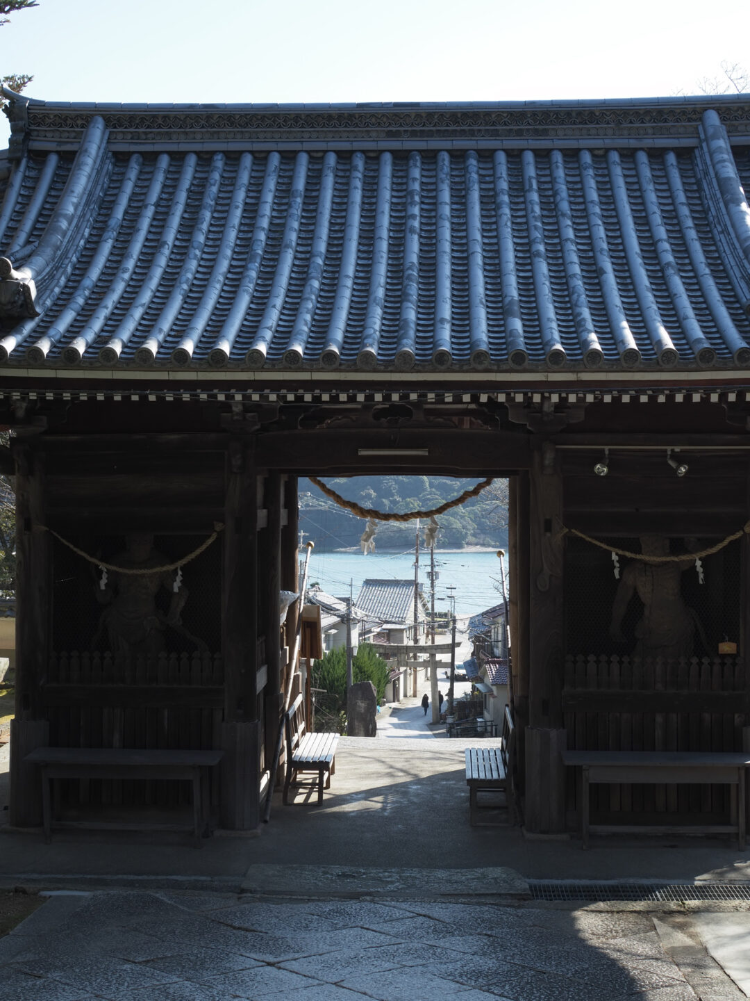 兵庫県西部に位置する坂越(さこし)にある大避(おおさけ)神社の随神門から海を望んで。この随神門は、大避神社が神仏習合時代には裏手にある妙見寺と一体だった歴史から、表に神社を守る随神像、裏に仁王像がそれぞれ左右に安置されている珍しい門です。ここから海を望むと短い距離で海抜が上がることがわかるとともに、海の向こうの生島までの距離も近いことが見て取れます。全体として伝えたいことが伝わりやすい奥行きでまとまっています。