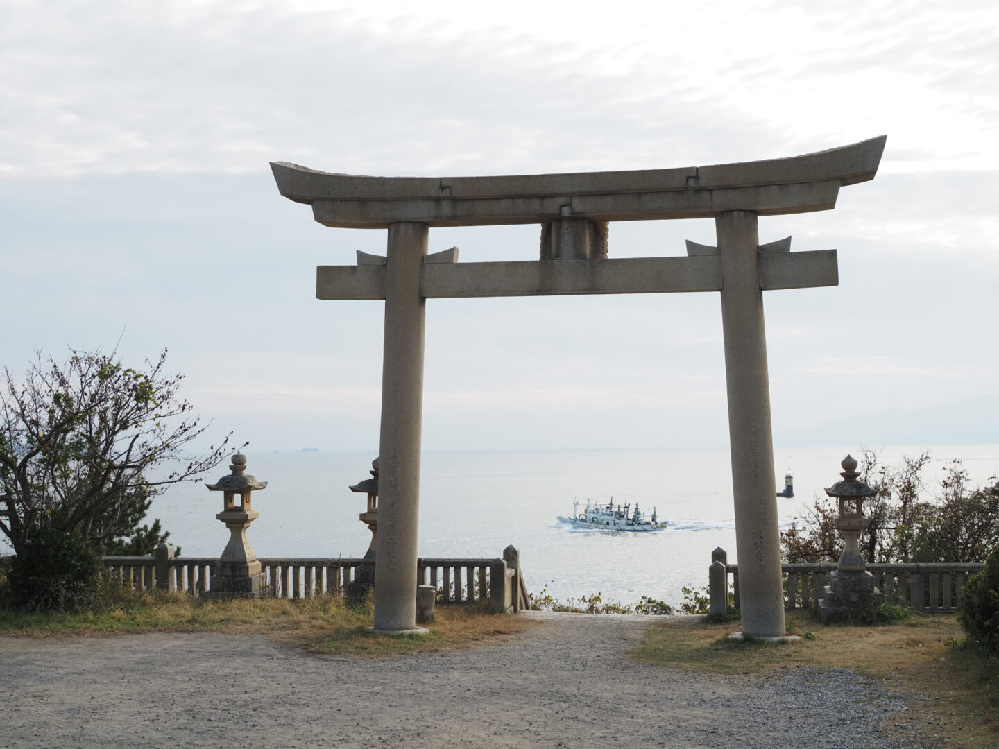 同じく兵庫県西部、赤穂市にある伊和都比売(いわつひめ)神社にて。鳥居の先は階段になっており、まるで鳥居のすぐ前に海が広がっているように見えます。ちょうど通りかかった漁船が鳥居の前にやってくるのを待ってシャッターを切りました。鳥居と海をゆく船のバランスが程よく画面に収まっています。