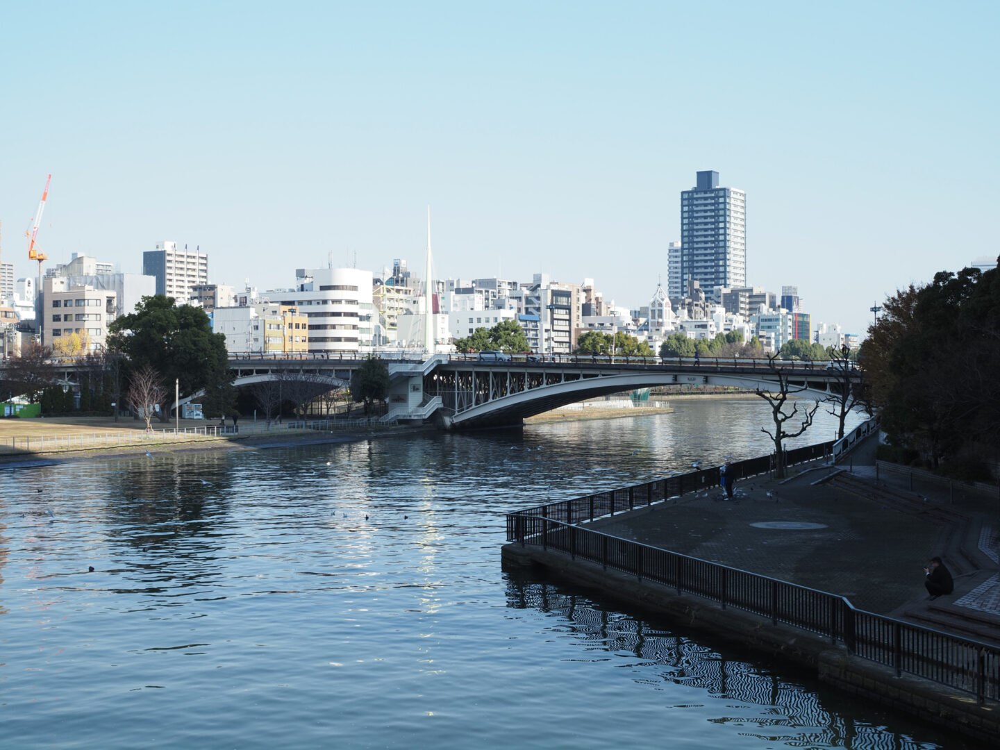 大阪市内をてくてく歩いていると、土佐堀川越しに天神橋を眺めるスポットに出ました。実際の視野は前述の通りもっと広いわけですが、あとからどんなものがあったかなど、思い返した際に浮かぶ景色、つまり記憶に近い画角のように感じられます。