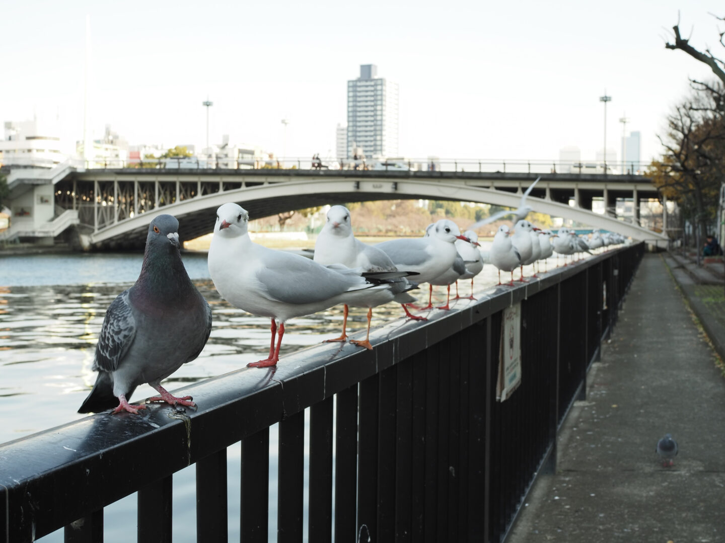 川岸の手すりにずらりと並ぶカモメに混じって一羽だけ違う子が (笑)。 人馴れしているようで、近づいても逃げないので彼らの規律を邪魔しない程度に寄ってみました。被写体に寄って大きく捉えつつ、長く続く遊歩道を入れることでこの画角でもしっかり奥行きが感じられます。