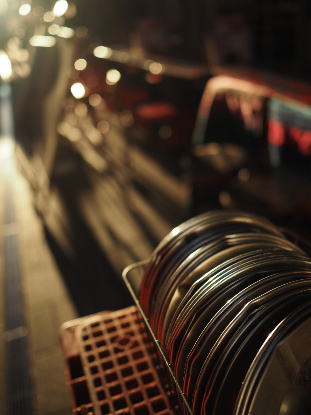 午後の斜光が正面からさす時間帯。飲食店が立ち並ぶ通りで、西陽が当たってキラキラと光る灰皿の金属感に目を奪われました。背景を大きくぼかしながらも縦構図で奥行き感を持たせて「いい光の時間」であることを伝えています。